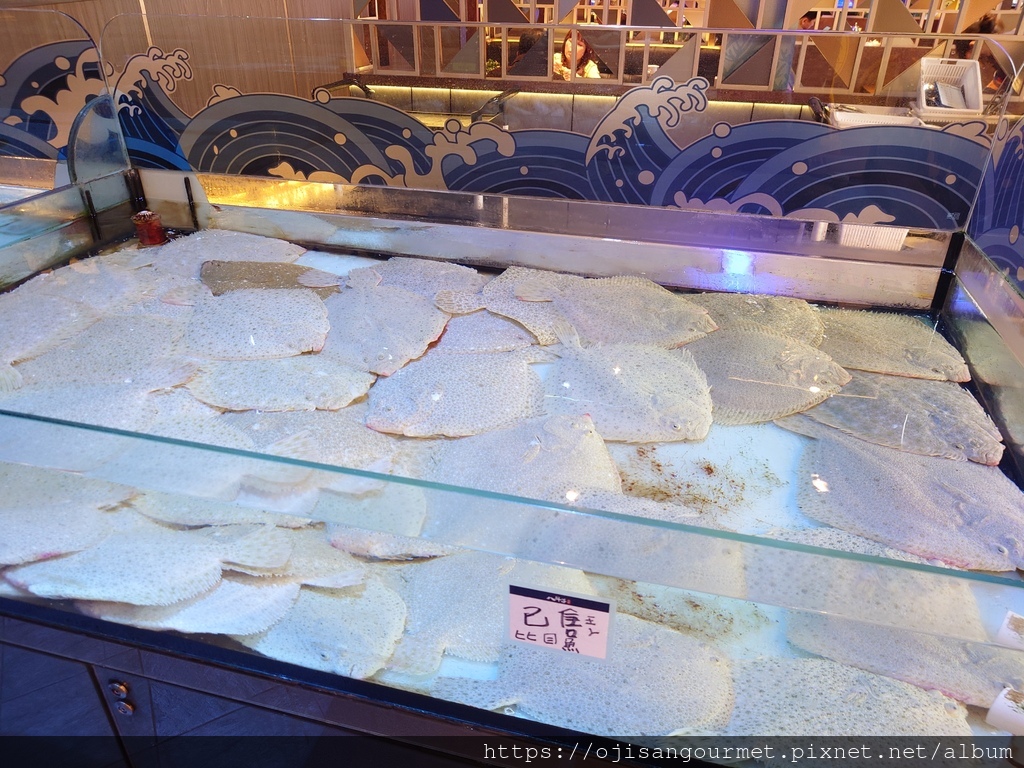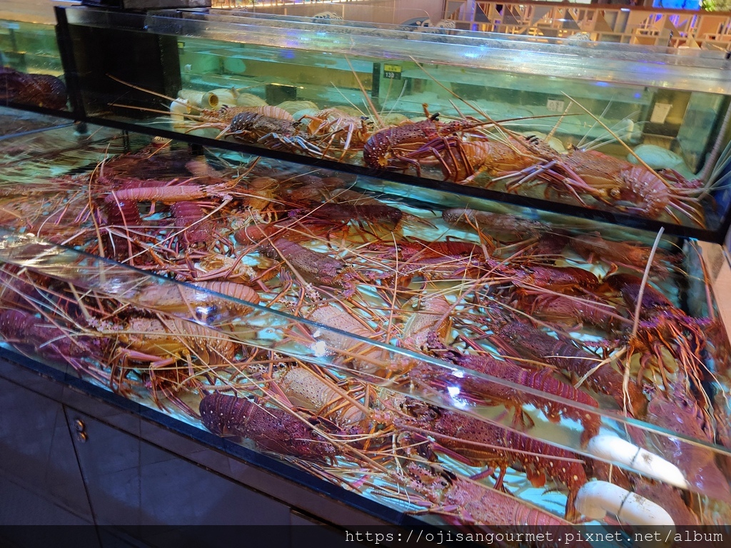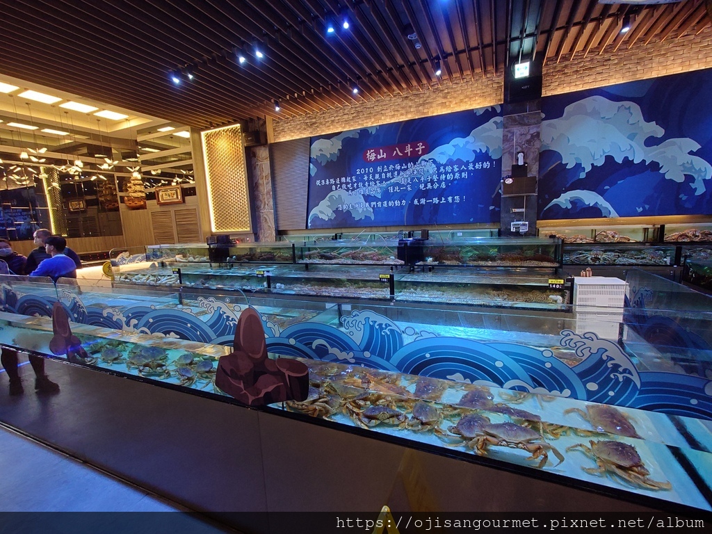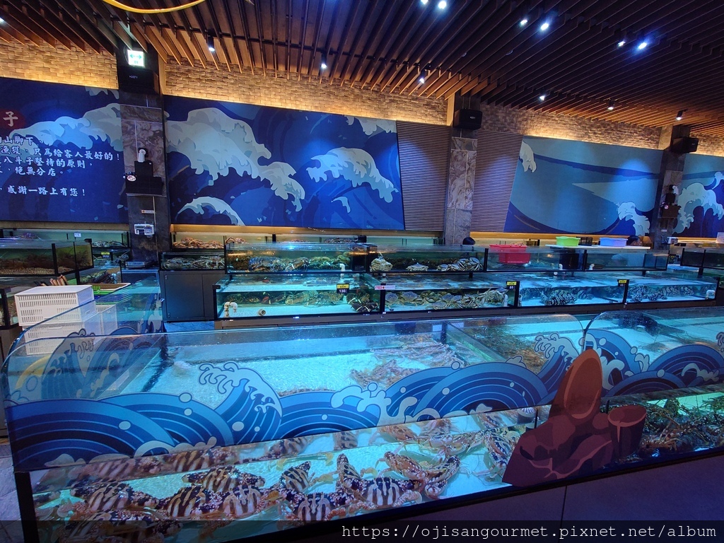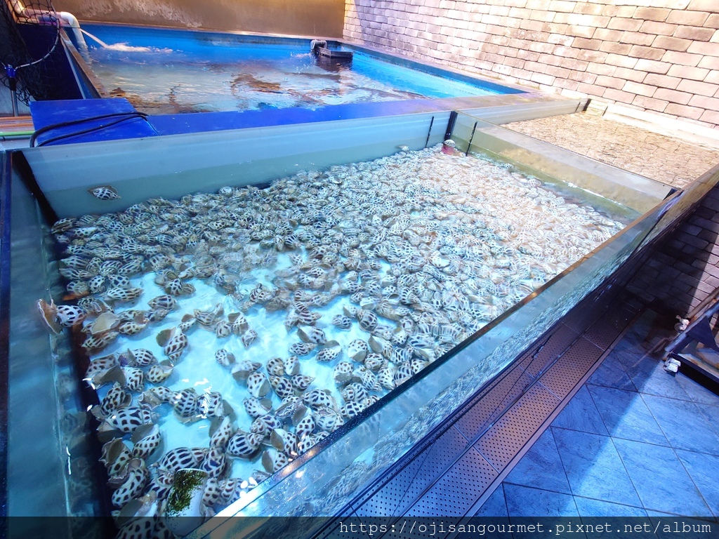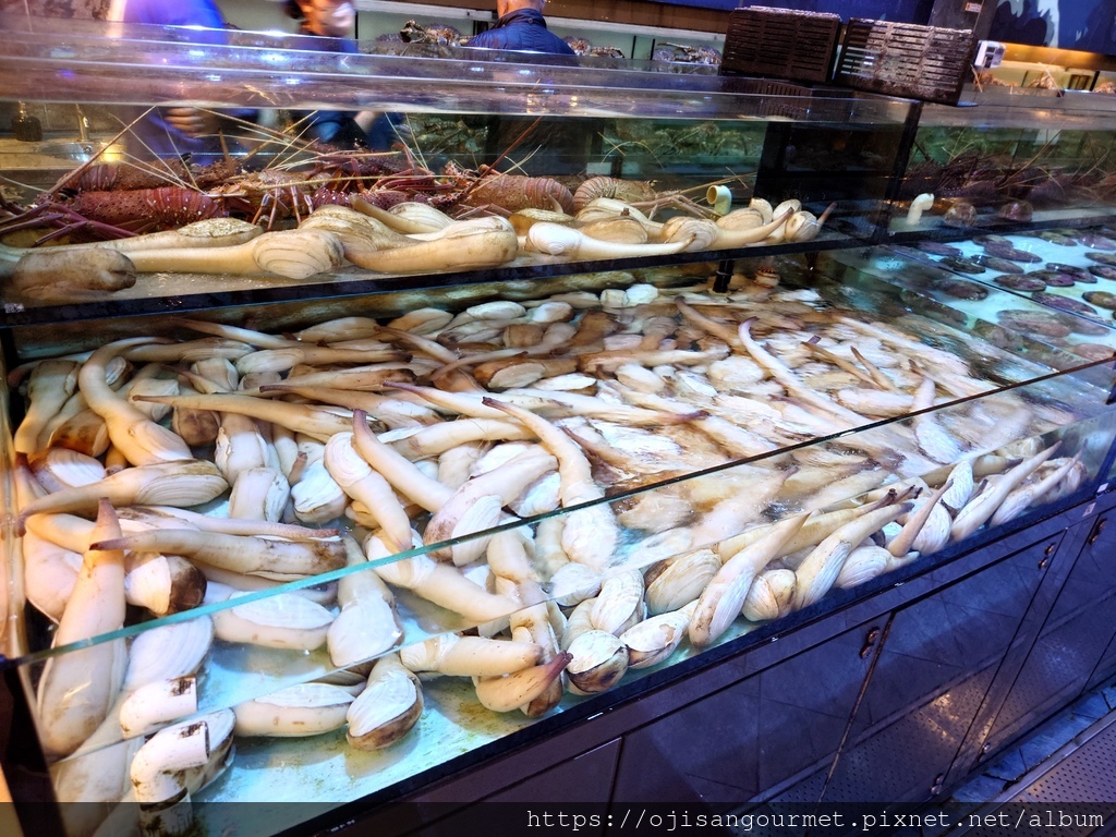 除了觀賞魚,【八斗子】也有媲美濱江市場水產暢貨中心的活體海鮮區,數十個大玻璃水族箱畜養著鱈場蟹(還不只一箱)、象拔蚌、澳洲龍蝦、日本生蠔、鱘龍魚、比目魚和鳳螺等等,琳瑯滿目,有如海鮮的大閱兵。