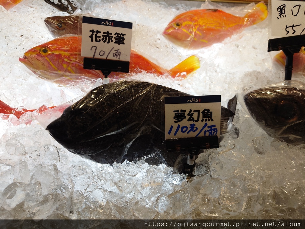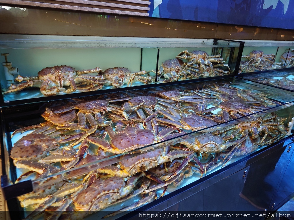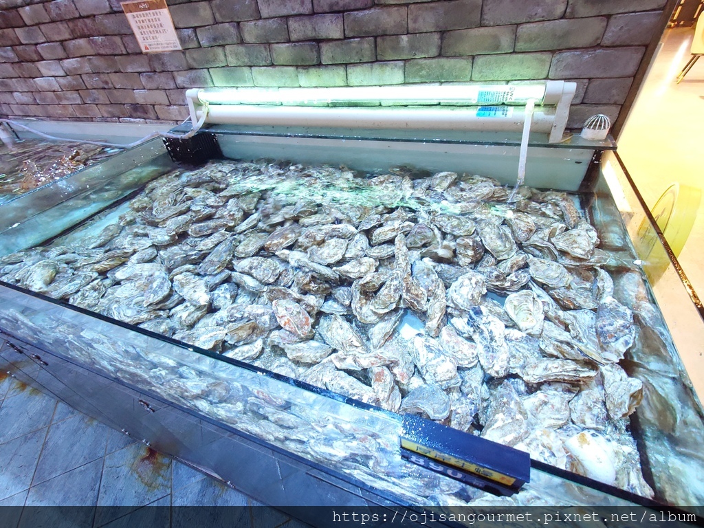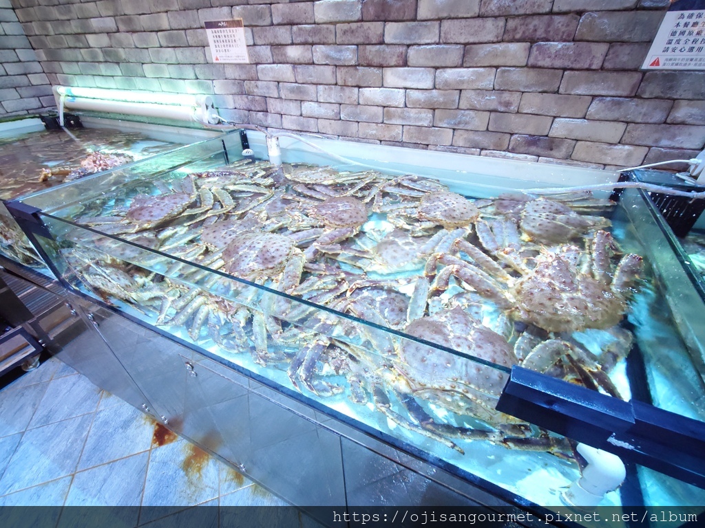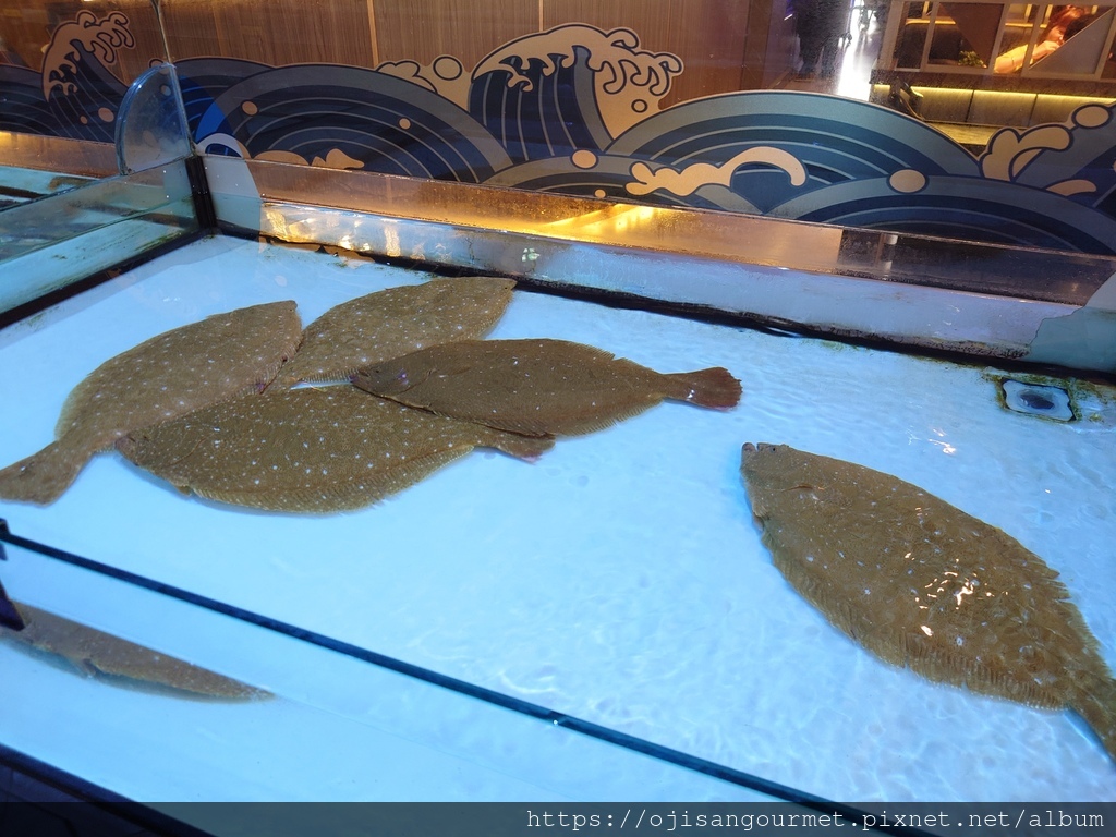 除了觀賞魚,【八斗子】也有媲美濱江市場水產暢貨中心的活體海鮮區,數十個大玻璃水族箱畜養著鱈場蟹(還不只一箱)、象拔蚌、澳洲龍蝦、日本生蠔、鱘龍魚、比目魚和鳳螺等等,琳瑯滿目,有如海鮮的大閱兵。