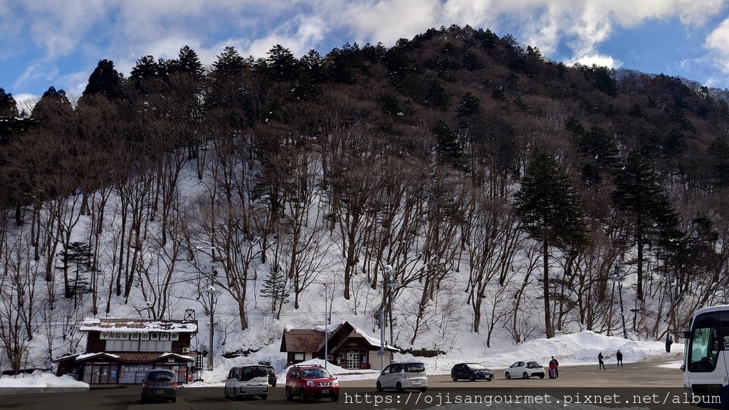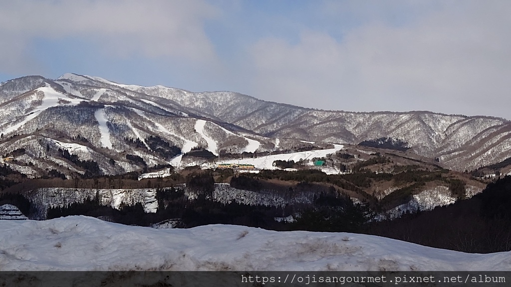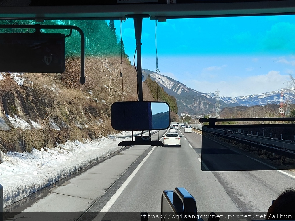 今天 Travex 公司為我們安排了台灣出身,精通英日語的領隊林孟學--林さん,語言能充分溝通,個性又認真,實在令人安心。搭上遊覽車,從國道途經岐阜市和美濃市後,開始進入山區以及上升路段,海拔也不斷提升,還沒到郡上市就已經可以看到車道兩旁有被鏟起的雪,遠方的高山也白了頭。出發大約兩小時不到,我們抵達位於蛭野高原,覆蓋在雪中的休息站。