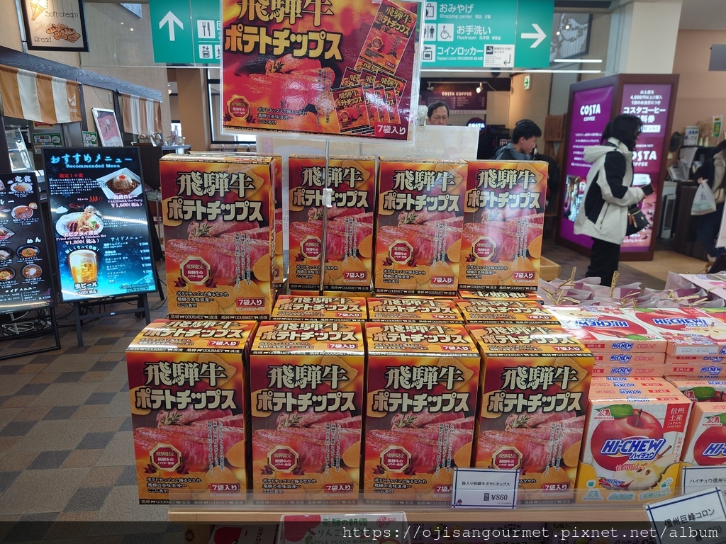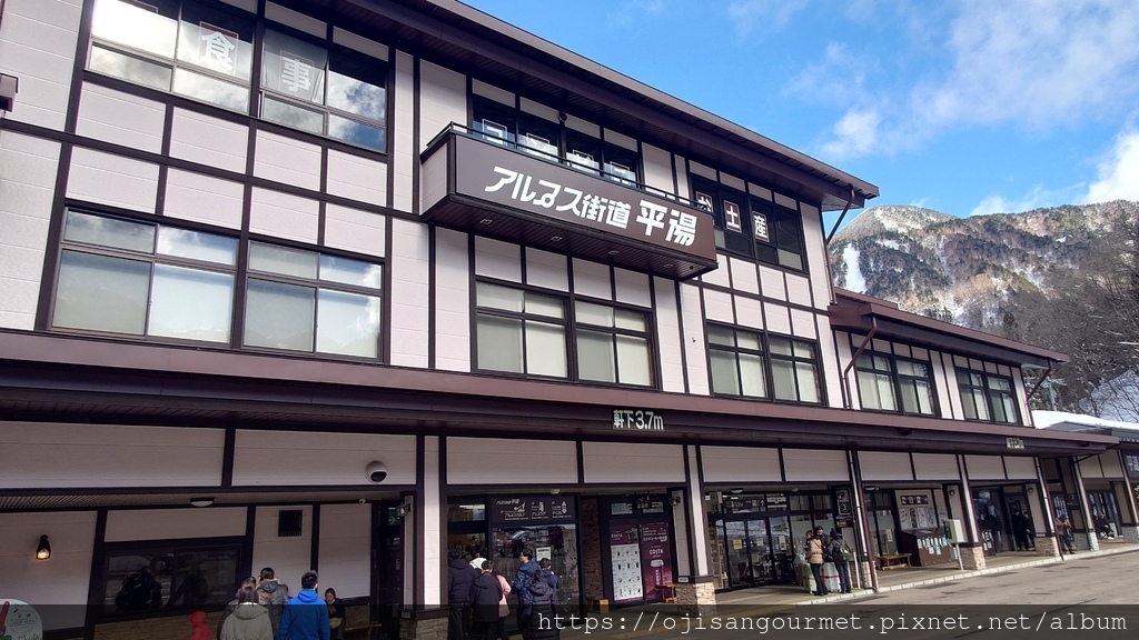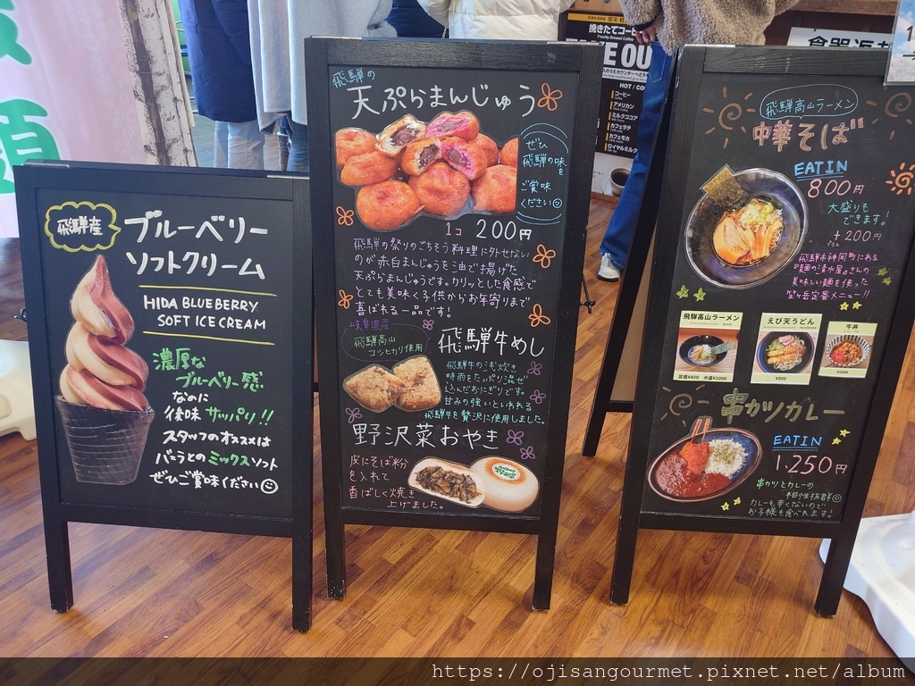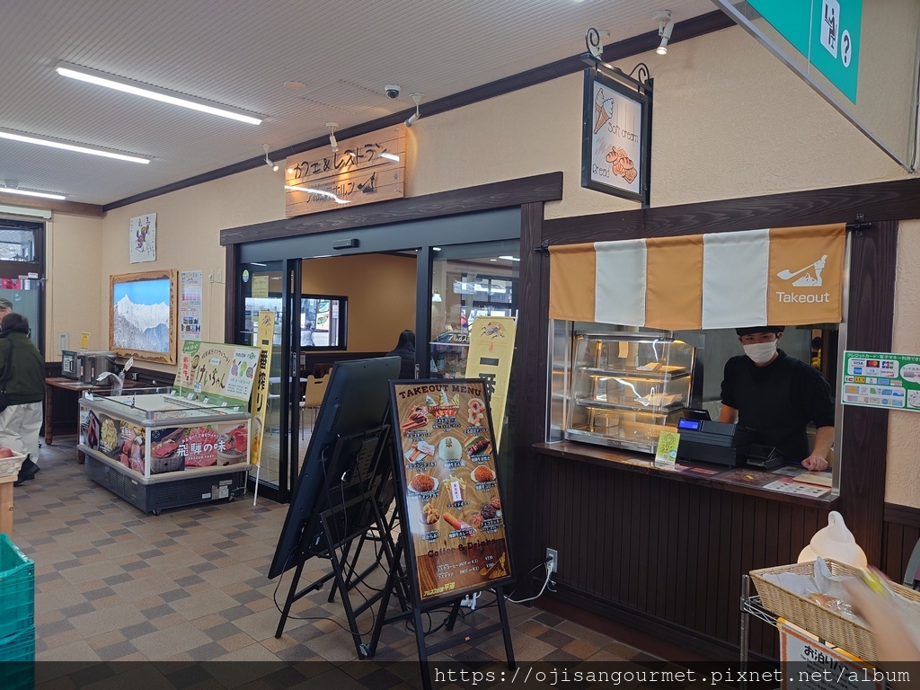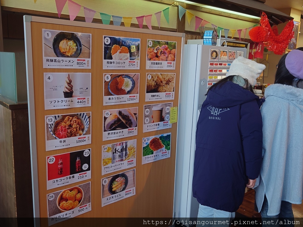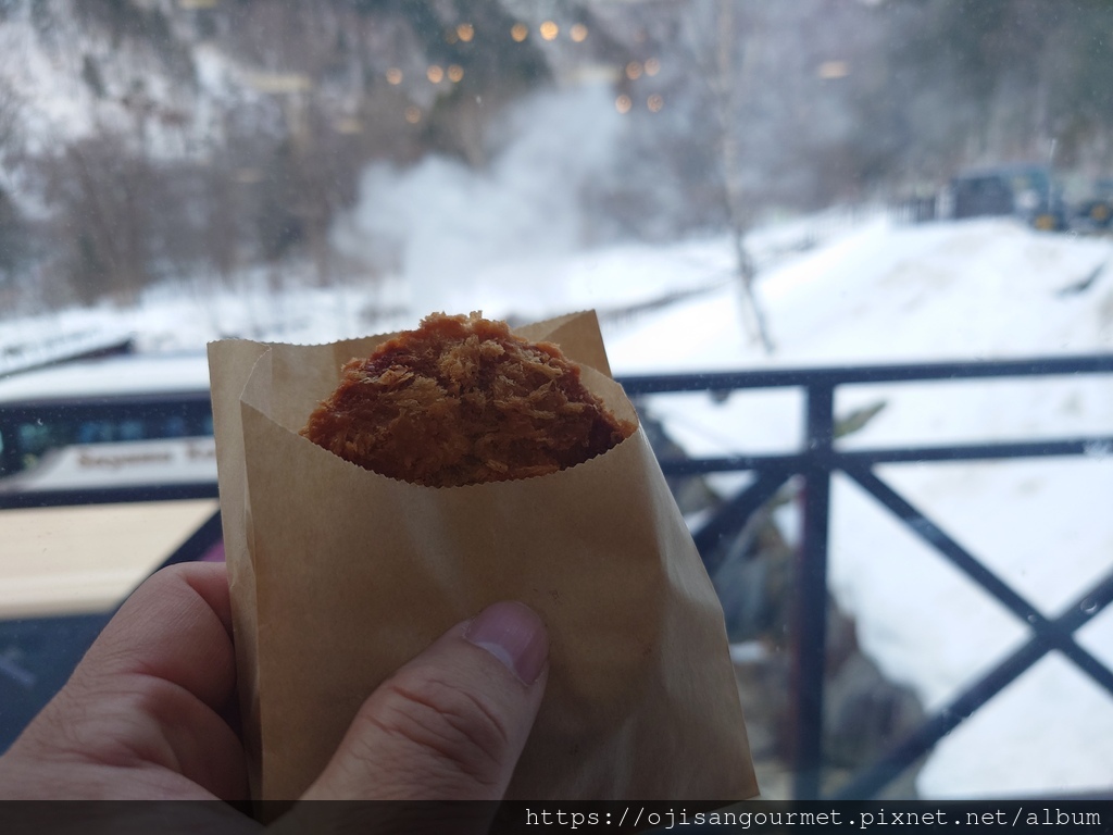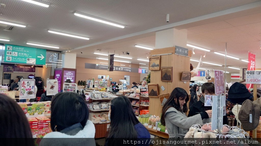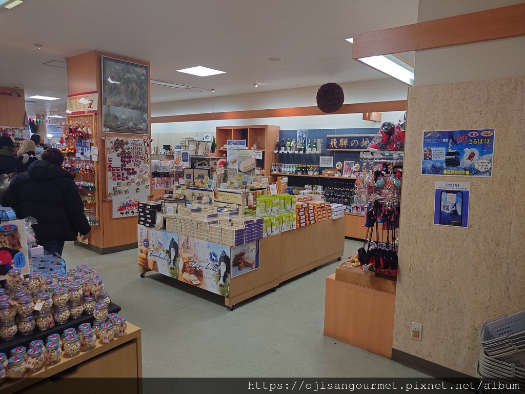 到了[新穗高溫泉站]確定距離發車還有相當充足的時間,我們總算放下心來,比較能悠哉地逛賣店,甚至肚子也開始覺得餓了。是的,不知道是不是因為天氣太冷,到日本至今常常覺得餓。這裡的名物之一是「飛驒牛可樂餅」,雖然天寒地凍,大小美女們還是點了「藍莓霜淇淋」(這一帶也是藍莓產地)以及「阿爾卑斯的布丁」。在能看得到停車場和遊覽車的地方用餐還是比較安心一點。