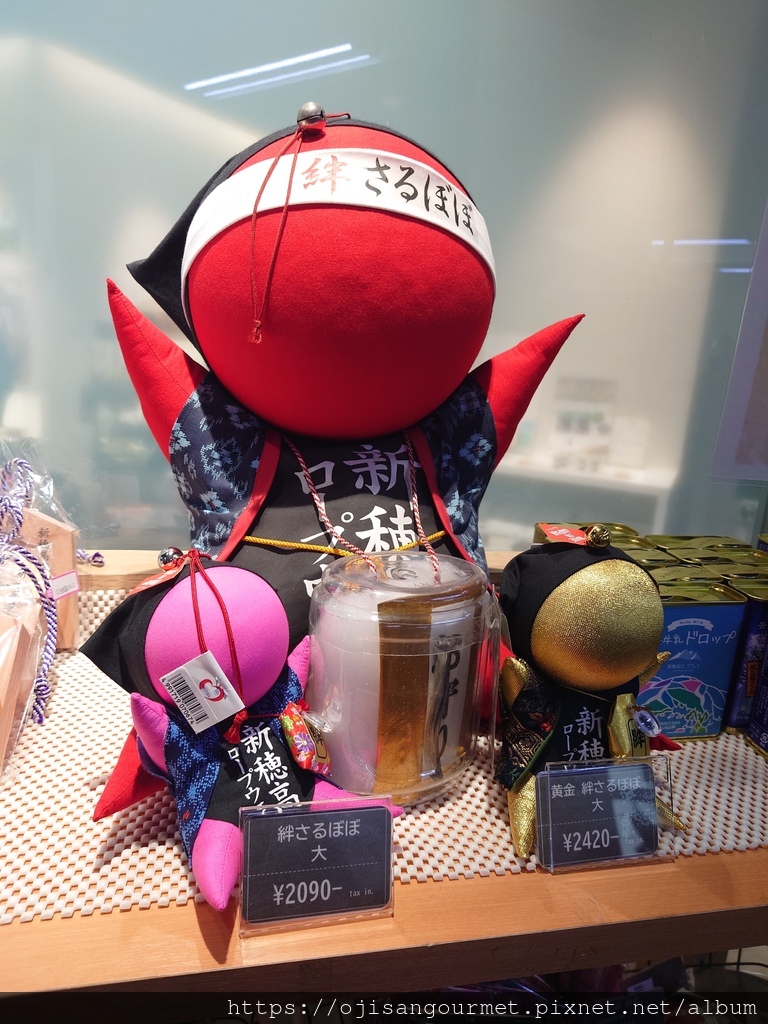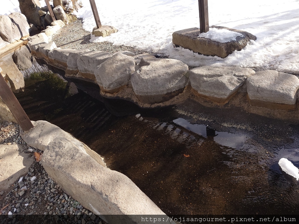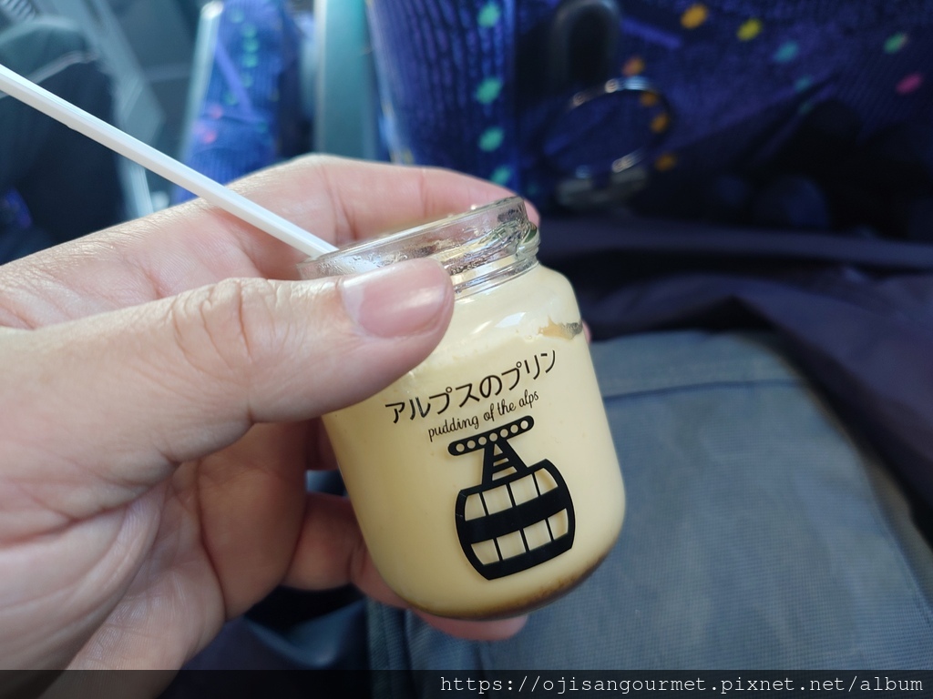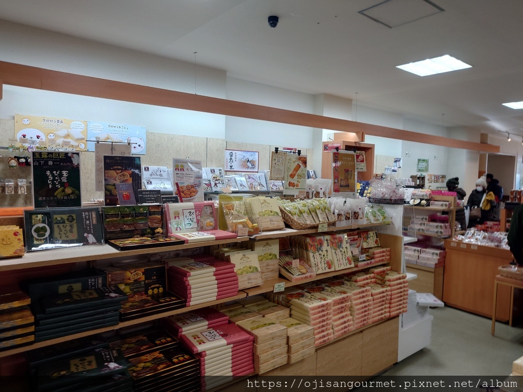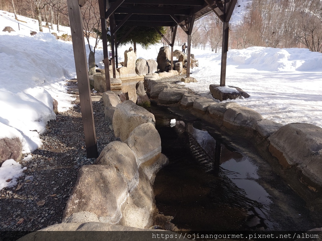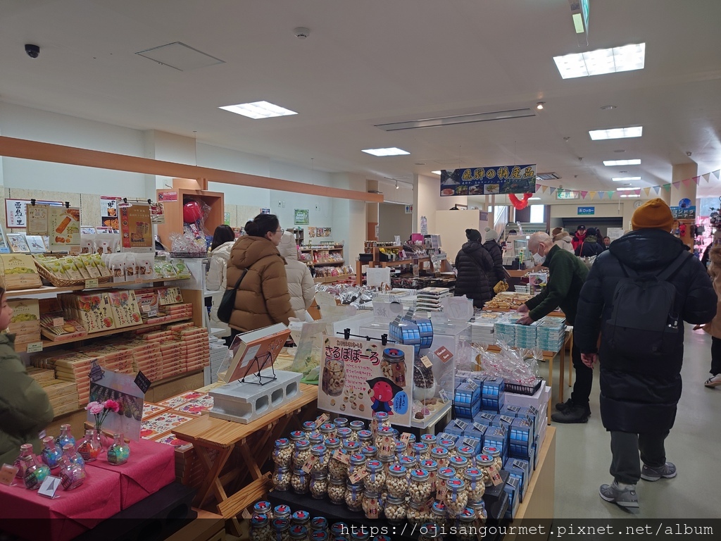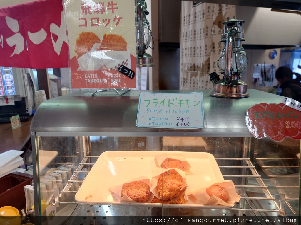 到了[新穗高溫泉站]確定距離發車還有相當充足的時間,我們總算放下心來,比較能悠哉地逛賣店,甚至肚子也開始覺得餓了。是的,不知道是不是因為天氣太冷,到日本至今常常覺得餓。這裡的名物之一是「飛驒牛可樂餅」,雖然天寒地凍,大小美女們還是點了「藍莓霜淇淋」(這一帶也是藍莓產地)以及「阿爾卑斯的布丁」。在能看得到停車場和遊覽車的地方用餐還是比較安心一點。