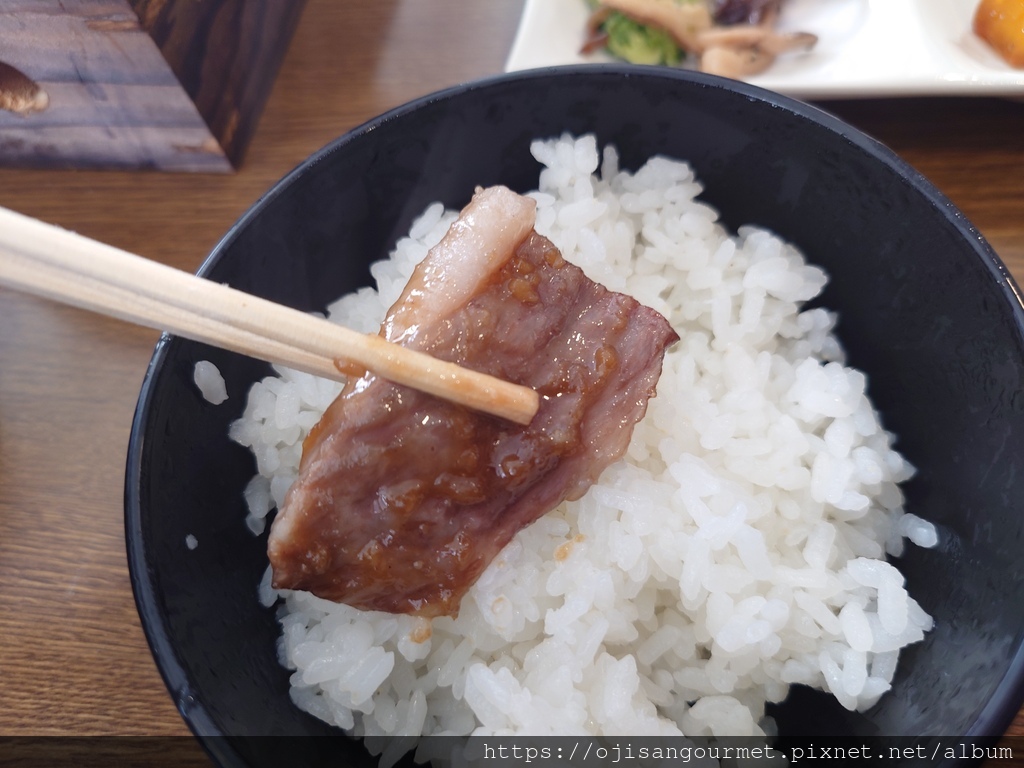 今天的牛肉部位應該是カルビ(牛小排),油花非常漂亮,但是不可避免會帶點筋,即使林さん鼓吹品質好的和牛千萬別過熟,還是建議至少七分熟,否則會筋會硬到咬不斷。