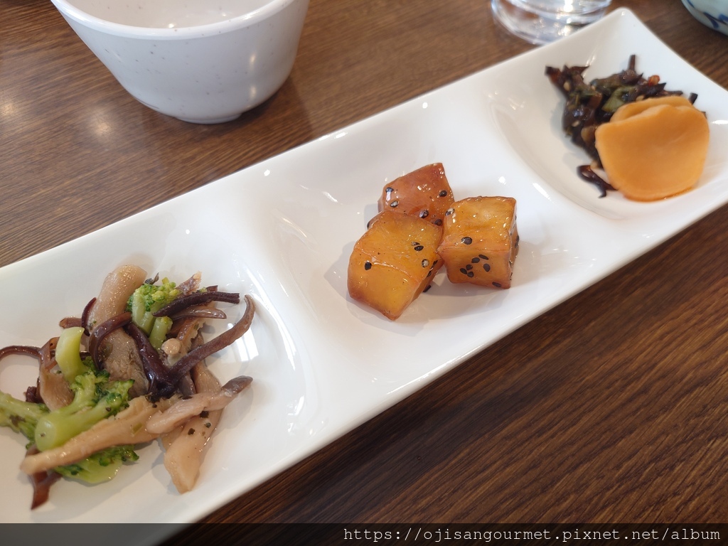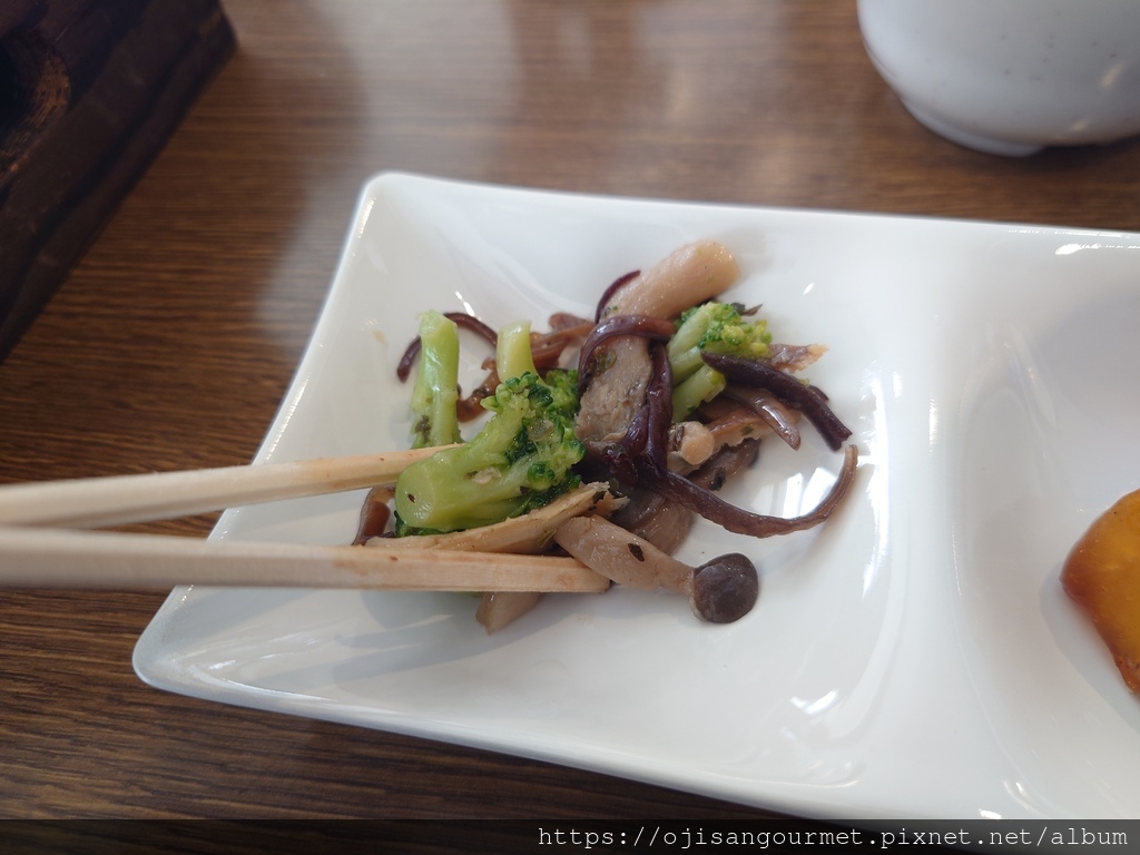 在等候牛肉烤熟的時間,大叔先嗑了蕎麥麵,麵湯略鹹,灑在蕎麥麵上的蔥花和蔬菜讓整體更為清爽。配菜中的漬蘿蔔非常爽脆,滑順的羊栖菜帶點微辣,十分開胃,吃到這兩種漬菜,想必會讓在外地的岐阜遊子們因思鄉而落淚吧!