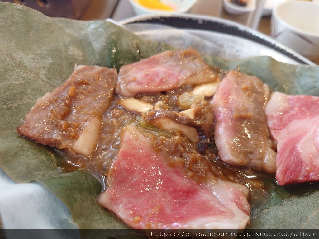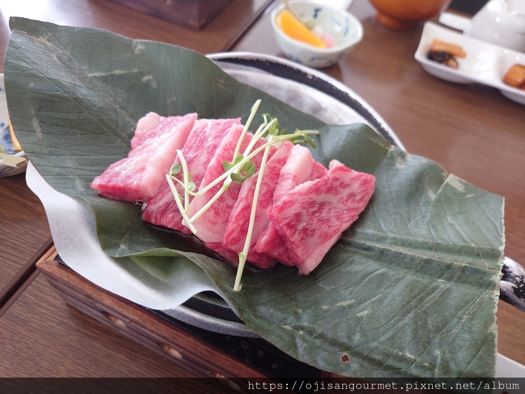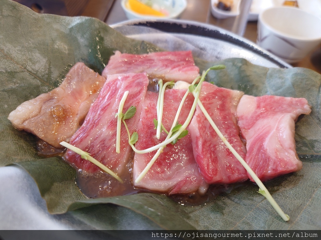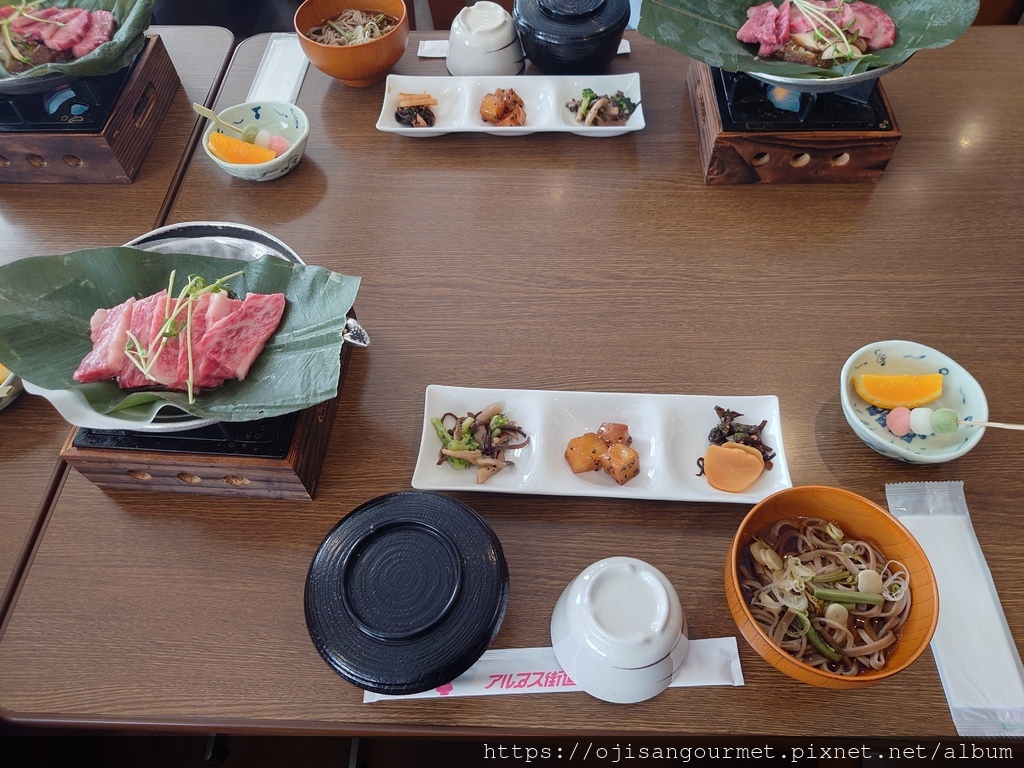 來到位於二樓的團體用餐區,我們的餐點已經安排好,除了已經放在鐵盤和朴葉上,蓄勢待發的和牛以及在地配菜,有趣是居然同時出現白米飯和蕎麥麵,日本人真的是喜歡“ 雙主食 ”的民族。