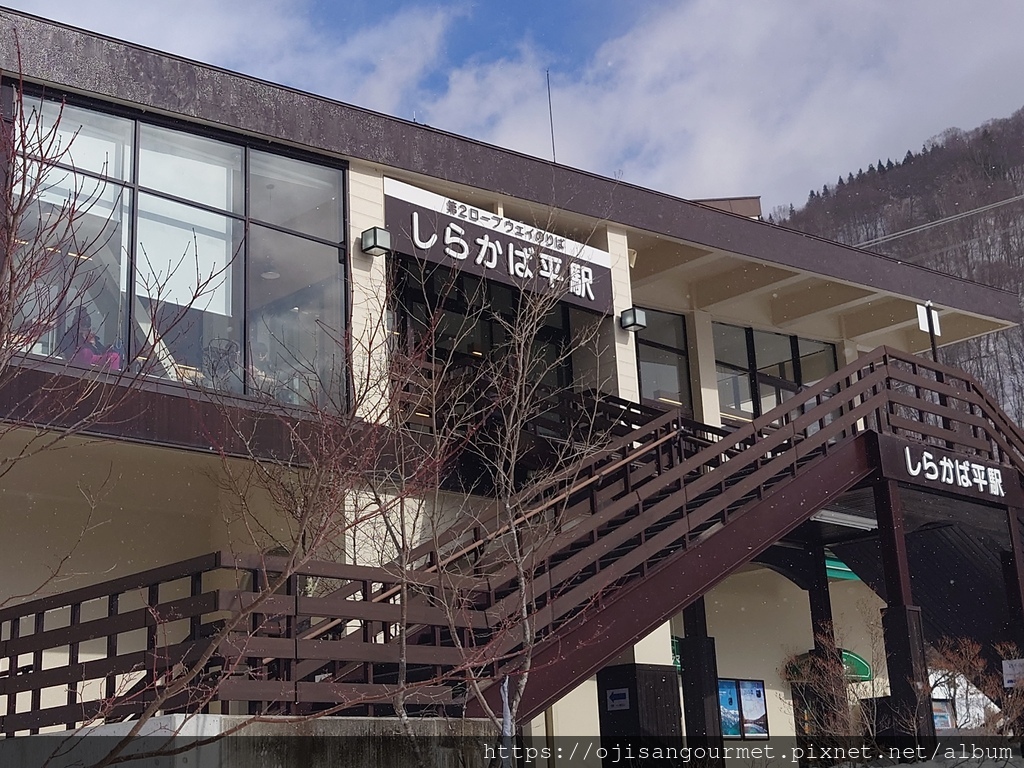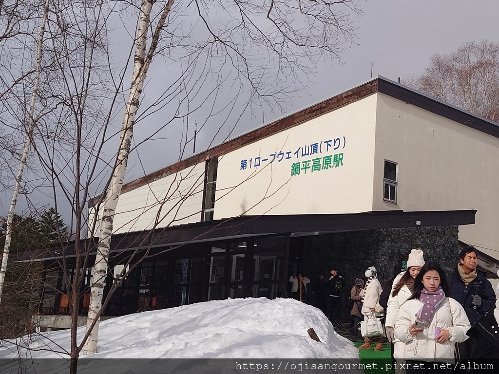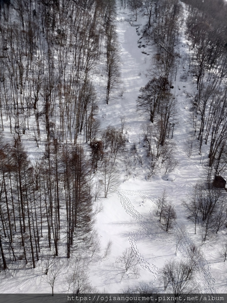 第一段上行纜車的終點在[鍋平高原站](海拔 1305 公尺),出站後經由步道前往第二段上行纜車起點的[白樺平站](海拔 1308 公尺)。有些積雪被反覆踩踏,已經凝固得非常堅硬,表面滑溜,不穿雪靴有滑倒的風險。這一段步道旁邊有扶疏的白樺木林,是日劇或者動畫中常見的雪國景象。