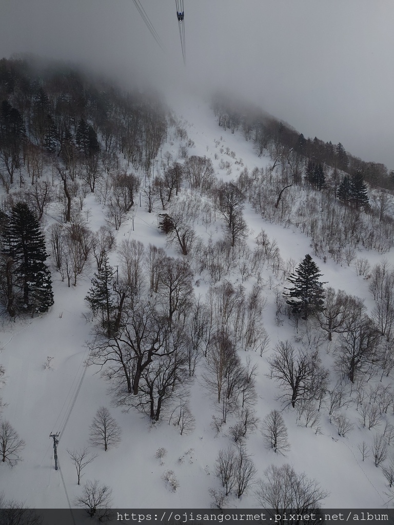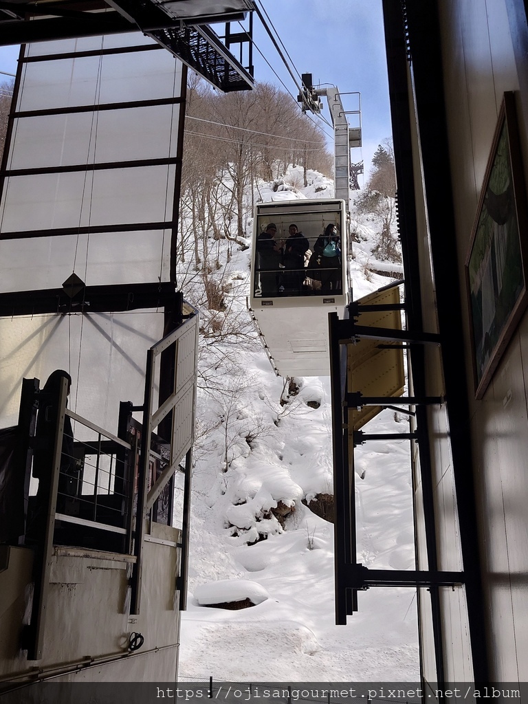 第二段上行的纜車是兩層樓的車廂,這次就很幸運地可以站在窗口旁的位置,當然要把握機會欣賞山嵐氳氳中的覆雪群山。途中會經過幾次轉折點,也就是纜車道梁柱的位置,軌道會改變角度,車廂也會因此晃蕩,引起大小不等的驚呼。