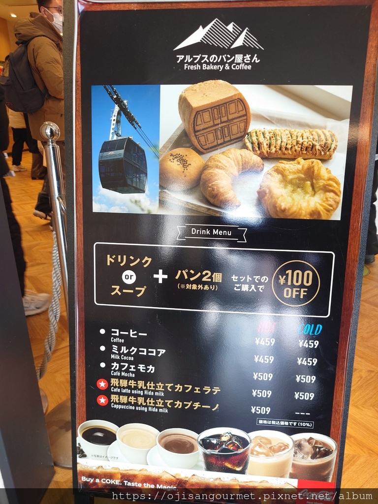 回程就時經過[白樺平站],不少遊客在二樓當著遼闊的窗景享用熱飲以及烘焙坊【アルプスのパン屋さん(阿爾卑斯的麵包房)】的各式麵包。當然,這些麵包也可以外帶到先前提到的足湯迴廊一邊泡腳一邊享用(雖然當天足湯並未開放)。