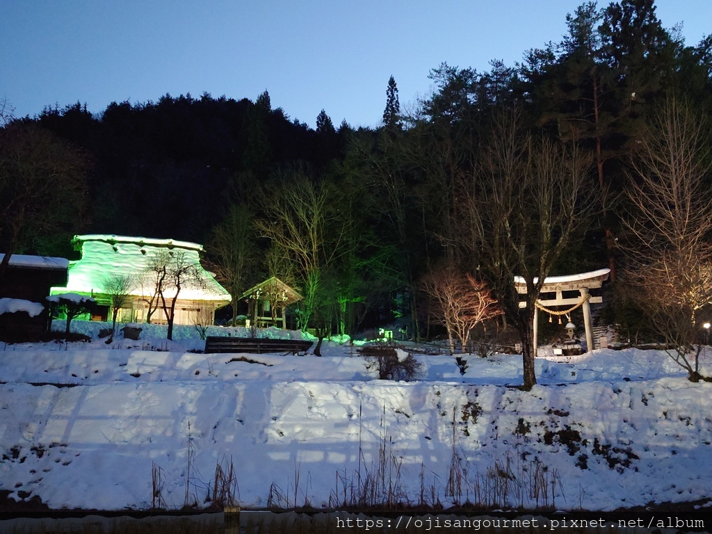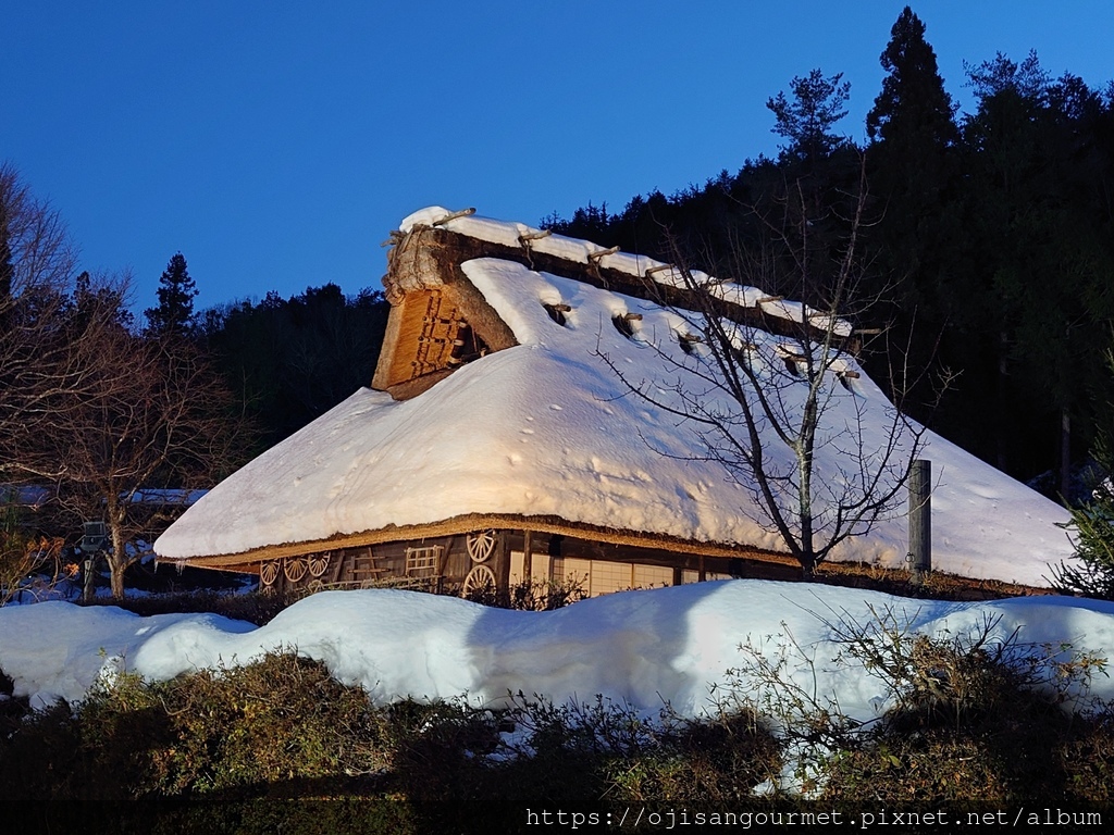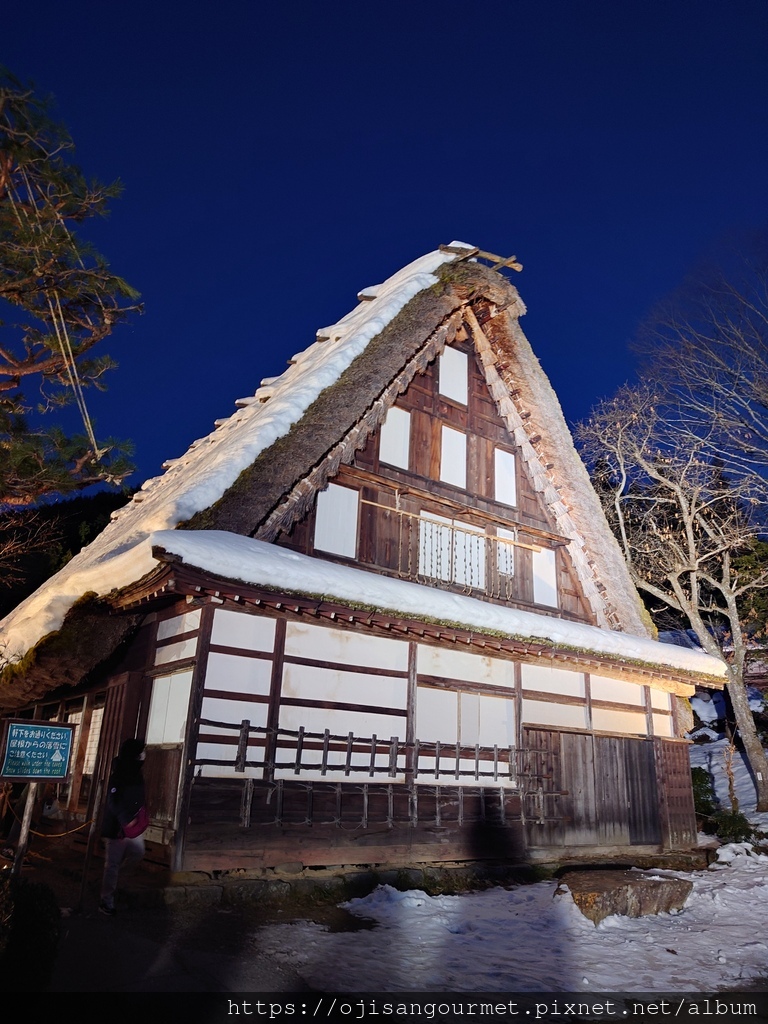 根據【飛驒之里】的觀光導覽地圖,被列為"國家指定重要文化物"的舊田中、田口、若山與吉真家剛好都在面對正門的第二排以後,比較沒有受到燈光的"眷顧",加上真的很冷,把目標放在燈光第一排的老屋。仔細地觀覽了舊富田家以及西岡家,雖然並未被列入重要文化物,依然各有特色。特別是舊西岡家,因為屋簷較矮,可以清楚地看到茅草屋頂的結構以及工法,簷下垂掛的冰柱在背景的燈光以及枝椏映照下,更是美得不可方物的雪國風情畫。據說這兩家在白天的時候會有當地的工匠示範專屬的表演,也是重要的文化傳承。