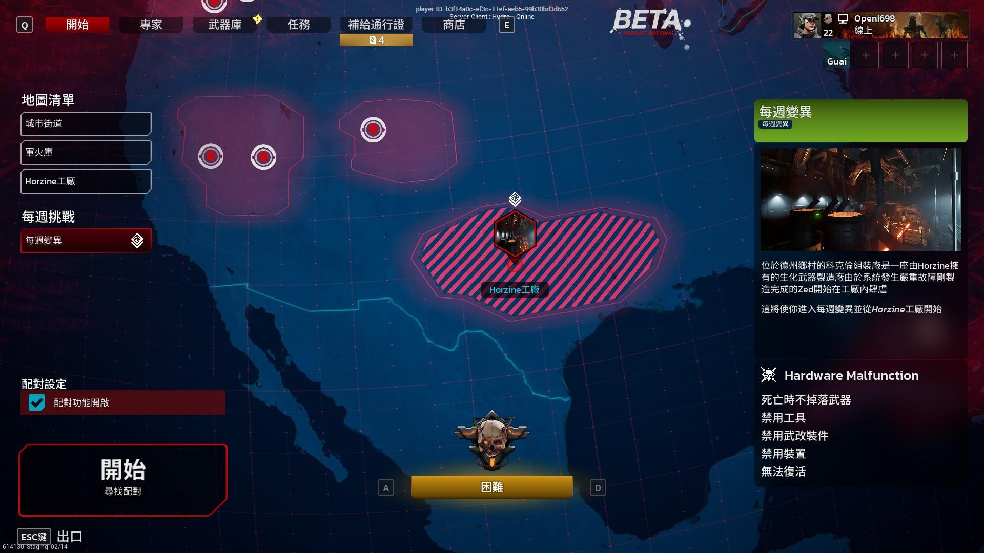 每週挑戰(或變異任務)理論上是對應到 KF2 的每週任務,在封測開始的前幾日每週挑戰下面是空的,無法選擇,如圖所示。
