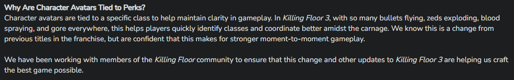 《Killing Floor 3》的角色頭像與特定職業綁定,是為了確保遊戲過程的清晰度,在《Killing Floor 3》的戰場上子彈橫飛、ZED 爆裂、鮮血四濺且又血肉橫飛,這種設計能幫助玩家迅速辨認職業,並在混亂中更有效協調作戰。我們了解會與先前的系列作品有所不同,但我們相信這樣的改動能帶來更強的即時遊玩體驗。