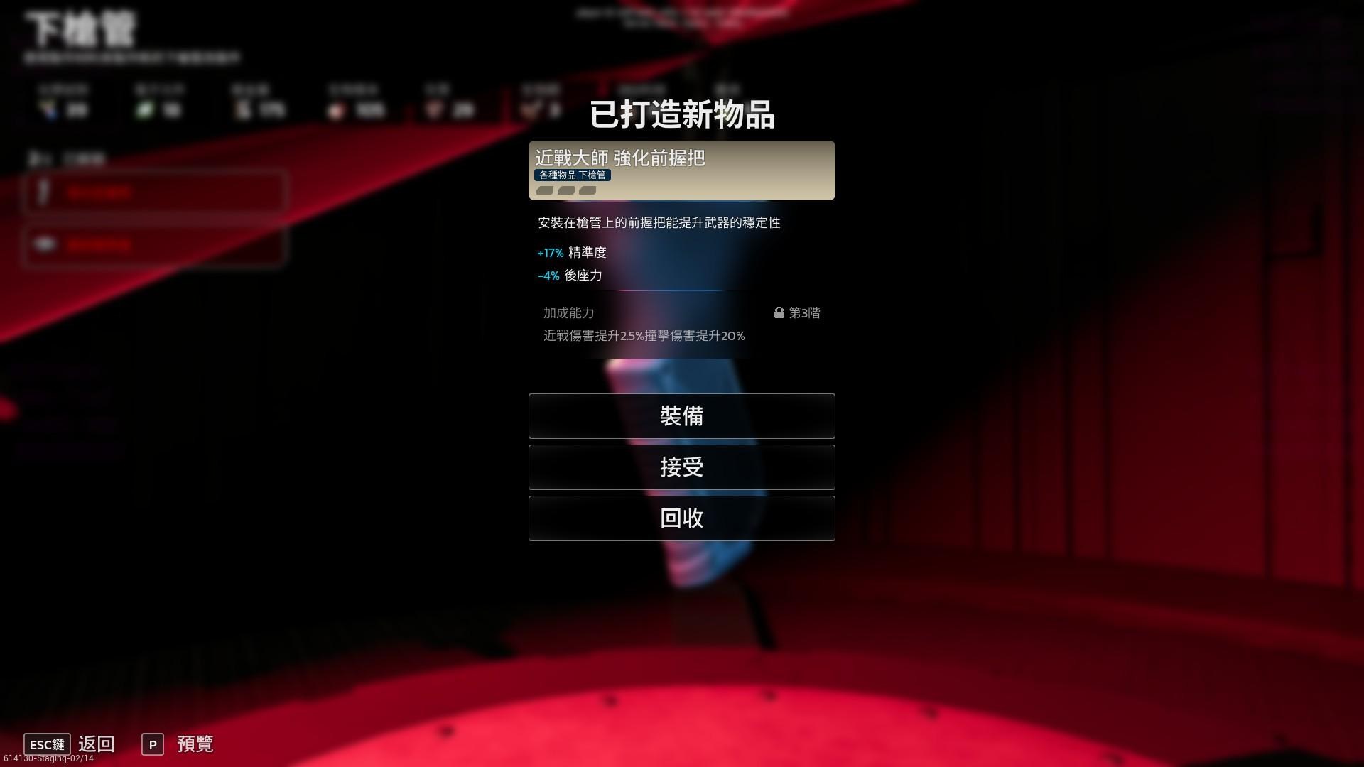 非常頭痛的是,必須先把配件做出來才會知道是什麼加成,製作組知道玩家會反覆一直做來洗詞條,所以還很好心的在你做好的當下可以選擇直接回收(回收率是三分之二)