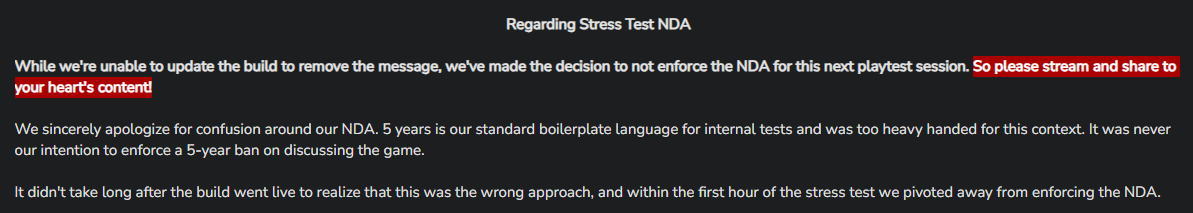 還沒開始玩第二次壓力測試,筆者覺得官方這次開放錄影和實況並不是大發慈悲,認真讀過他們發出的公告個人推敲他們「誠摯地道歉」中並未承認在壓力測試中加入 NDA 來禁止玩家錄影或實況是錯誤的決定,感覺官方依然有意要執行 NDA,但後續可能怕激怒玩家影響預購,也擔心早已被冠上*不聽取社群的臭名將持續惡化,所以就以封鎖五年太嚴重為由矇混過去。