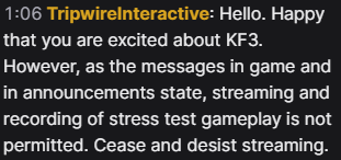 當日凌晨也真的有勇者直接在 Twitch 上直播,沒多久就看到 Tripwire Interactive 的官方帳號出現在聊天室裡留下了這樣的一段話: