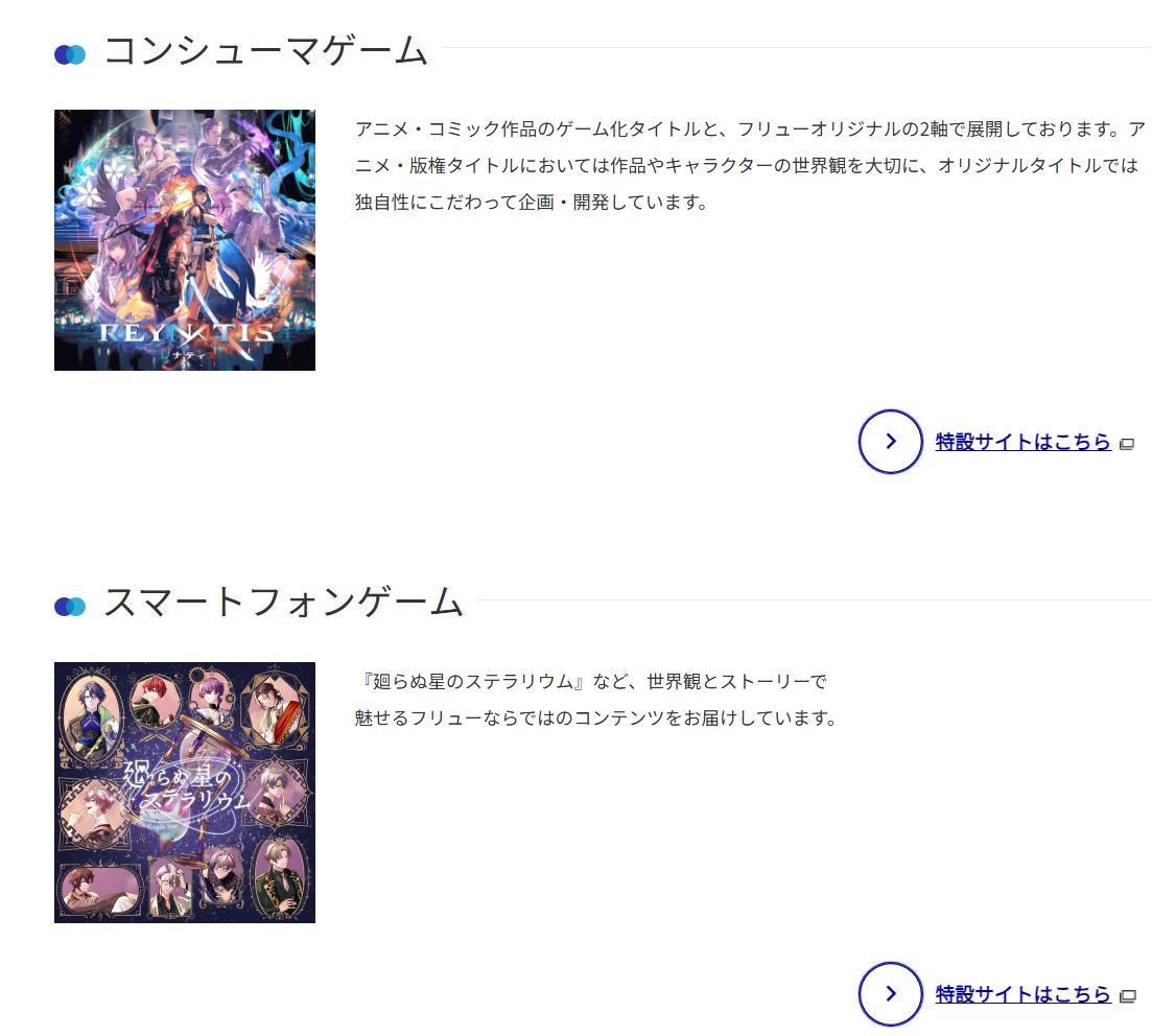 讓我們把視野拉回到 FuRyu 的動畫模型部門,這塊又分成了「模型景品」與「遊戲/動漫」兩個版塊,其中在遊戲動漫中有介紹到 FuRyu 經營的原創遊戲/手游(沒聽過呀......)