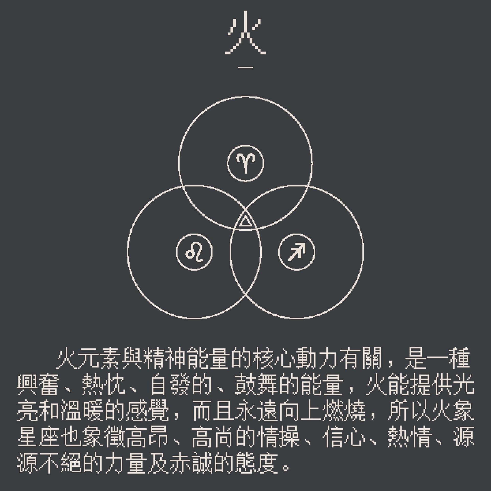 火元素與精神的核心動力有關,是一種興奮、熱忱、自發的、鼓舞的能量,它代表讓事情發生的驅力,或確立驅力的一種需求及對意義的渴望,而火能提供光亮和溫暖的感覺,而且永遠向上燃燒,所以火象星座也象徵高昂、高尚的情操、信心、熱情、源源不絕的力量及赤誠的態度,火象星座通常比較有願景,有鼓舞人心的才能,牡羊以拓荒者、戰士、奮鬥者的姿態行動,獅子以忠誠、高尚、重視榮譽的特質為核心,射手保持著熱切的態度追求意義及成長,並追尋心中的信仰,但當火元素被過度強化時則可能出現階段性的瓦解,會出現缺乏自制力、造成無心的傷害、缺乏耐心或缺乏細膩覺知的狀況。