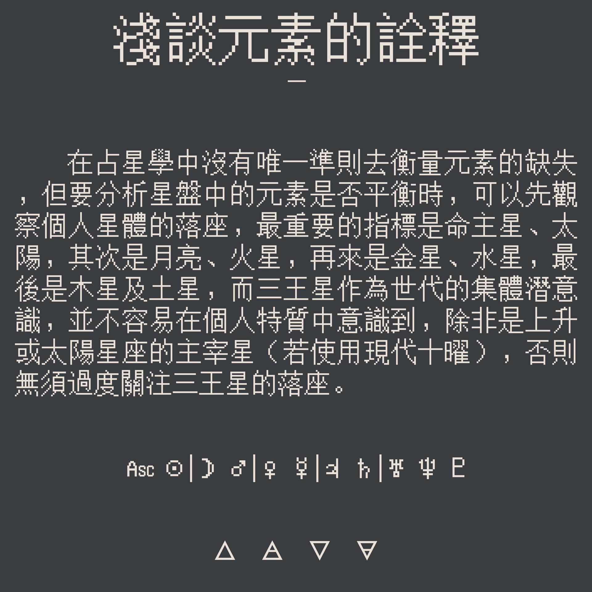 在占星學中沒有唯一準則去衡量元素的缺失,但要分析星盤中的元素是否平衡時,可以先觀察個人星體的落座,最重要的指標是命主星(上升星座主宰星)、太陽,其次是月亮、火星,再來是金星、水星,最後是木星及土星,而三王星作為世代的集體潛意識,並不容易在個人特質中被意識到,除非是上升或太陽星座的主宰星,否則無須過度關注三王星的落座(可參考,但不建議過度強調三王星)。