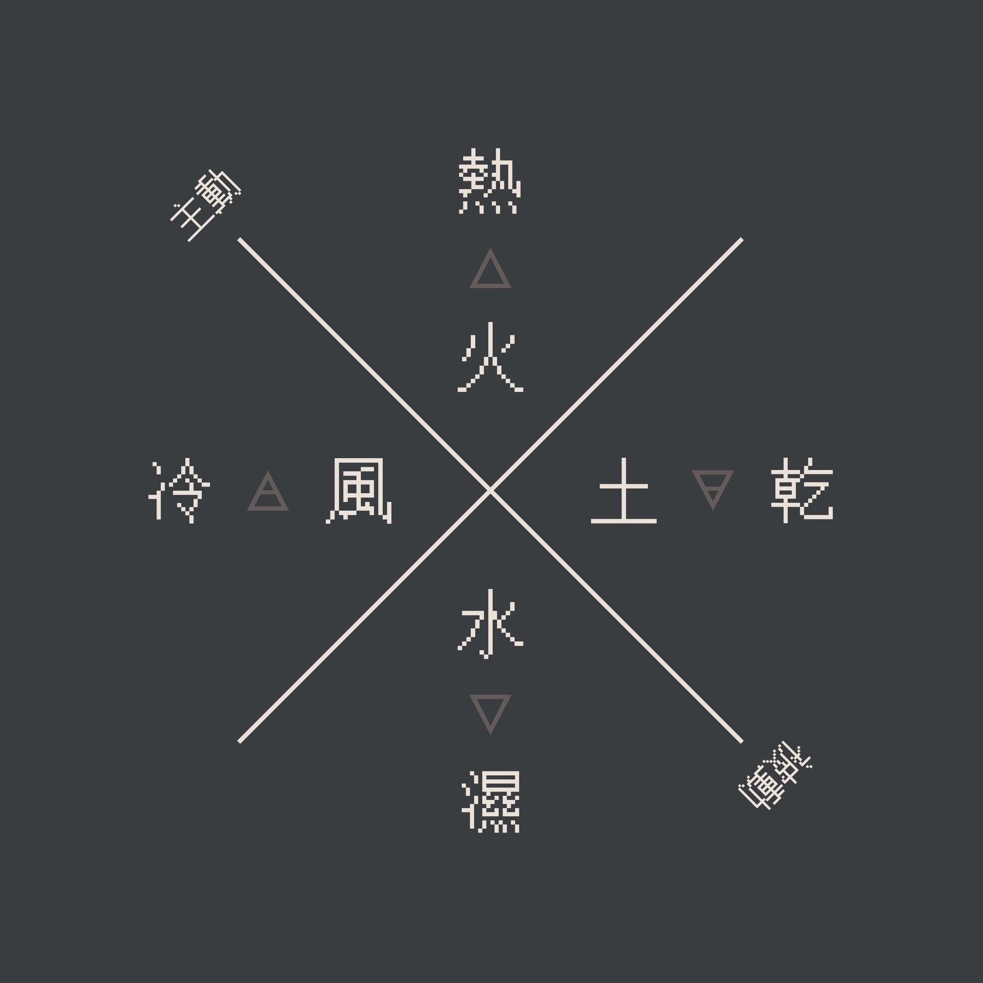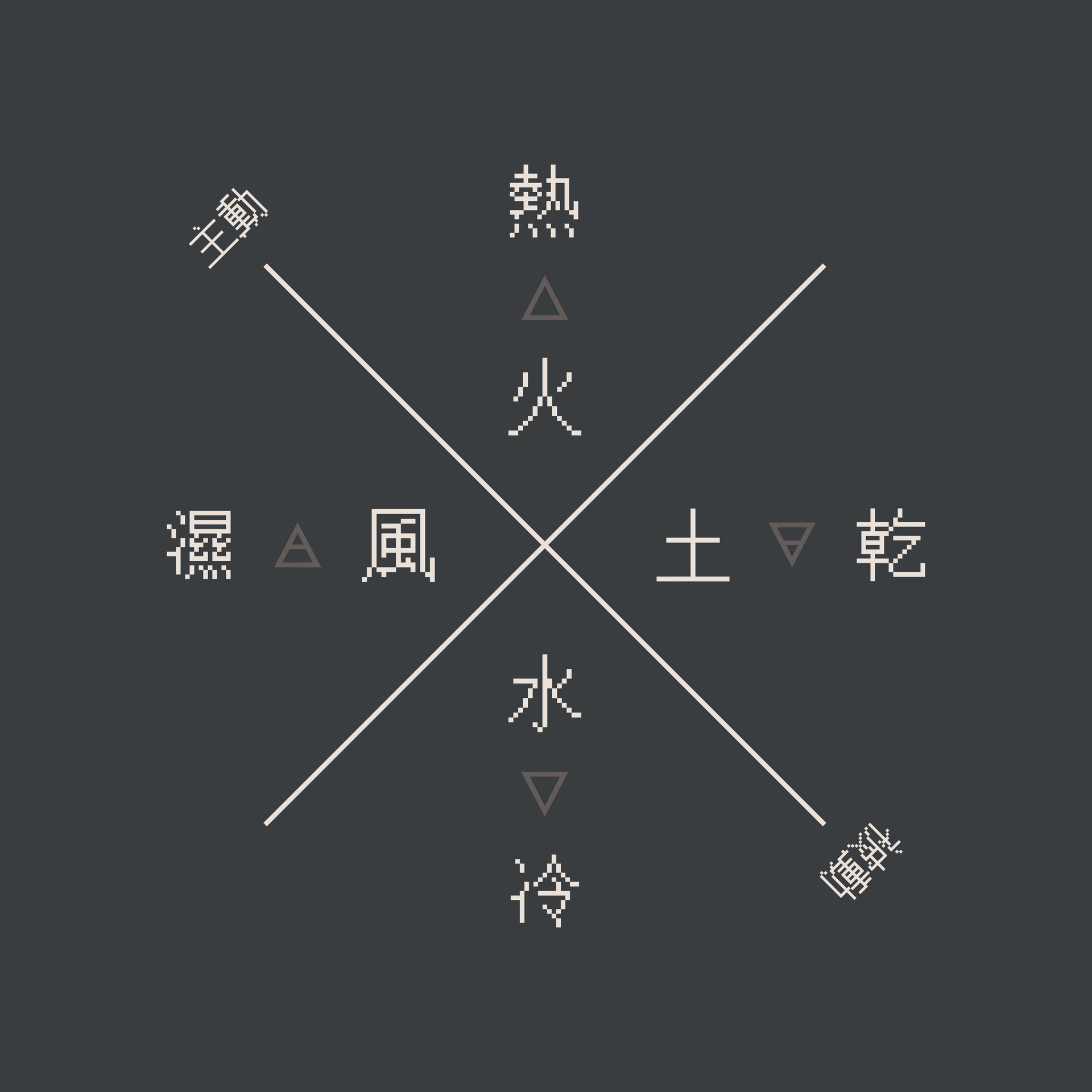 四大元素依據它們的特性又可以將火、風視為操控和擴張式的能量表現,水、土則是維持和集中的能量表現,火和風都會向外延伸或昇揚並持續擴張,所以也和輕浮的特質相關,水、土則一向和重力及遲緩的能量有關,這兩個元素善於將能量蓄積在底層,所以是與沈澱的特質相關。