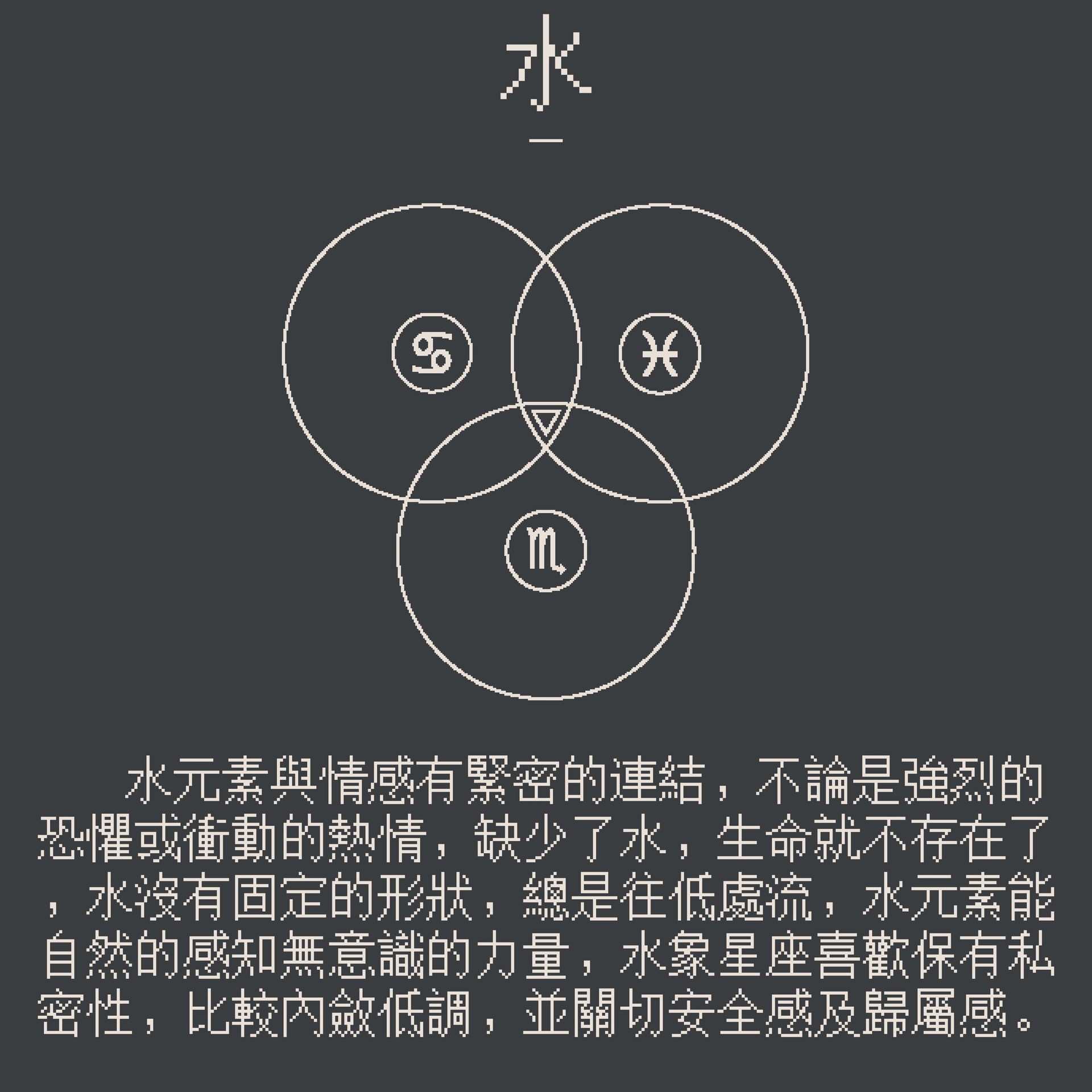 水元素跟深刻情感有緊密的連結,不論是強烈的恐懼、衝動的熱情、包容性及創造性,水能淨化、濕潤或將東西溶解,缺少了水,生命就不存在,水沒有固定的形狀,且總是往低處流,由於感受的本質多半來於潛意識的層次,水元素能自然的感知無意識的力量,但通常難以覺察深層的動機,若是抗拒內心的感受,則容易被慾望、非理性的恐懼所困,水象星座喜歡保有私密性,比較內斂低調,並關切安全感及歸屬感,當這種灰色地帶被他人觸及時容易激起警覺心,巨蟹關切提供歸屬感的所在,天蠍在意強烈的親密關係,雙魚則追尋某種融合感。水象星座如同水一般,能夠映照外在世界,對環境變化極為敏感,容易在潛意識層面吸收周遭情緒,這讓它們具有強烈的共鳴能力,但同時也容易受困於他人的情緒起伏,而過度強化的水元素可能造成依賴、脆弱易感、過度情緒化、自保傾象及操弄情緒。