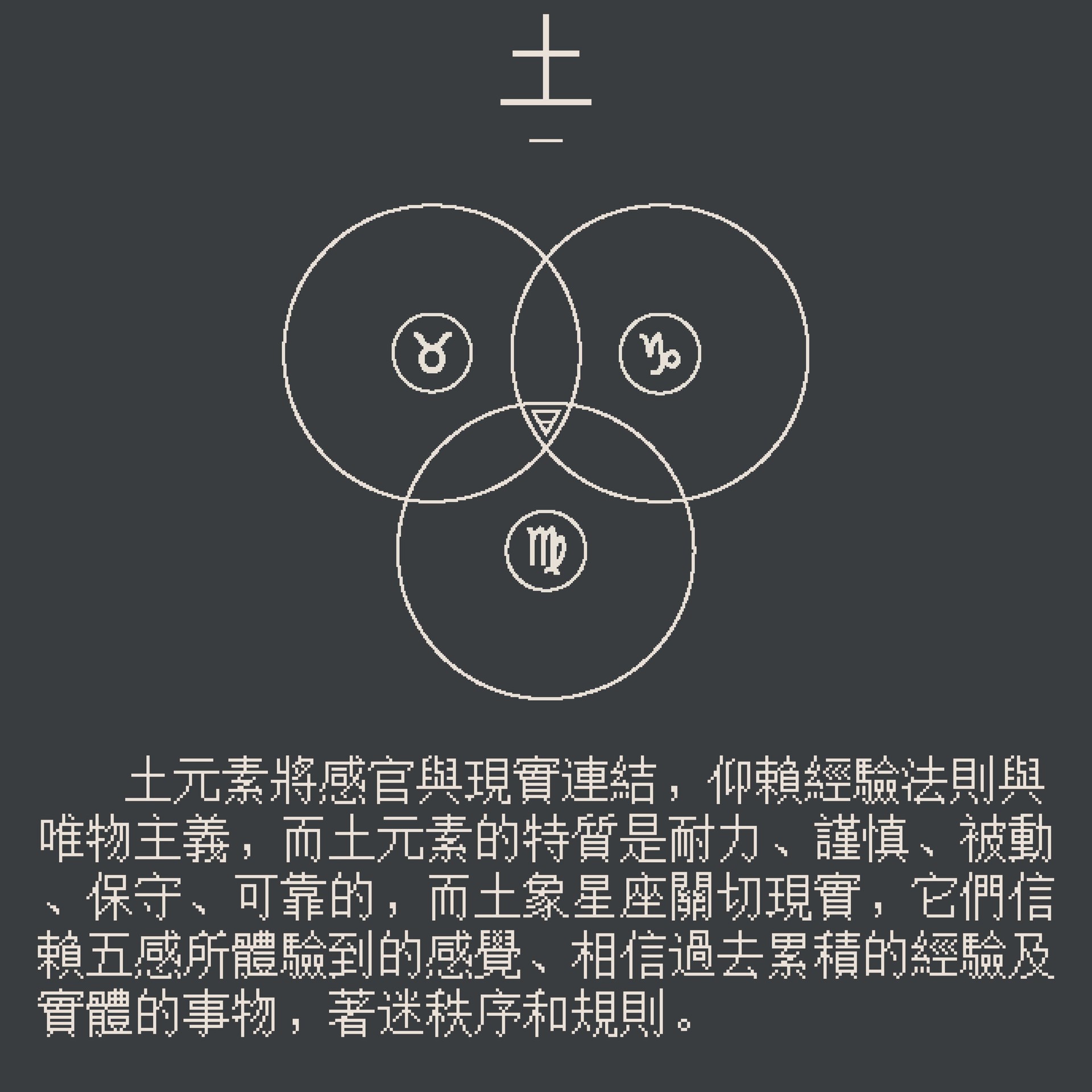 土元素能將感官與現實連結,仰賴經驗創造出的知覺和邏輯推演,土元素與物理層面的事物特別相應,它們重視有形的資源與穩定的結構,並展現耐力、謹慎、被動、保守與可靠的特質,而土象星座關切唯物主義和現實法則,它們信賴五感所體驗到的感覺、相信過去累積的經驗及實體的事物,著迷秩序和規則,並拒絕風險及不切實際的態度,金牛座善於物質上的保存與蓄積,摩羯則有謹慎及堅忍的特質,處女則擅長規劃分析及整理分類,但處女座是變動土象,且主宰行星為水星,所以是最不典型的土象星座,反而參雜著沙子的特質(流動土),土象星座關切物質及經濟面的保障,並追求樸實、穩定的基礎,而土元素被過度強化可能卻乏創意、想像力、過分重視物質、保守或觀點狹窄單一。