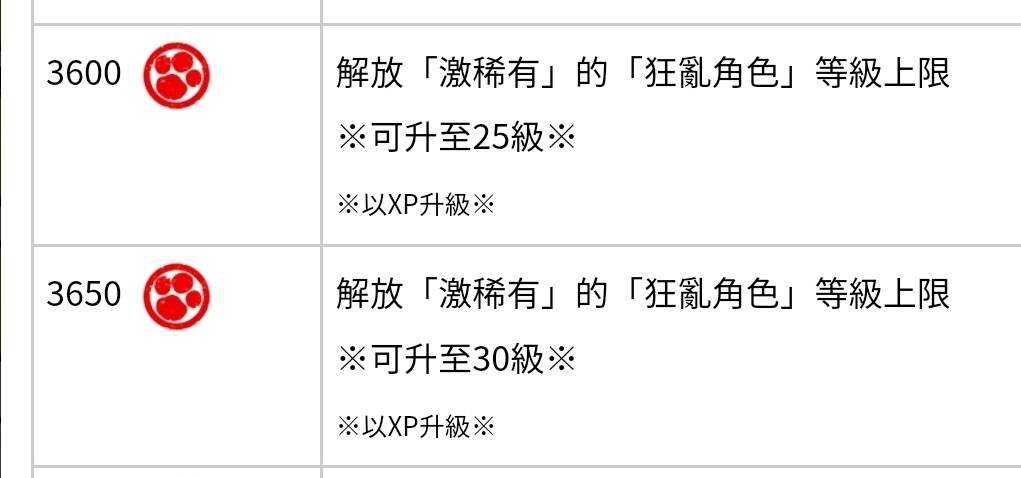 狂亂貓的升級較為特殊,一開始拿到最高升到20等,等牌達到3600後可升到25等,達到3650可升到30等,30~50跟其他激稀有貓一樣,狂亂系列升級所需的XP數較其他激稀有多,推薦升牆、腿、鳥、魚、龍,但還請玩家們依照自己的需求升級。
