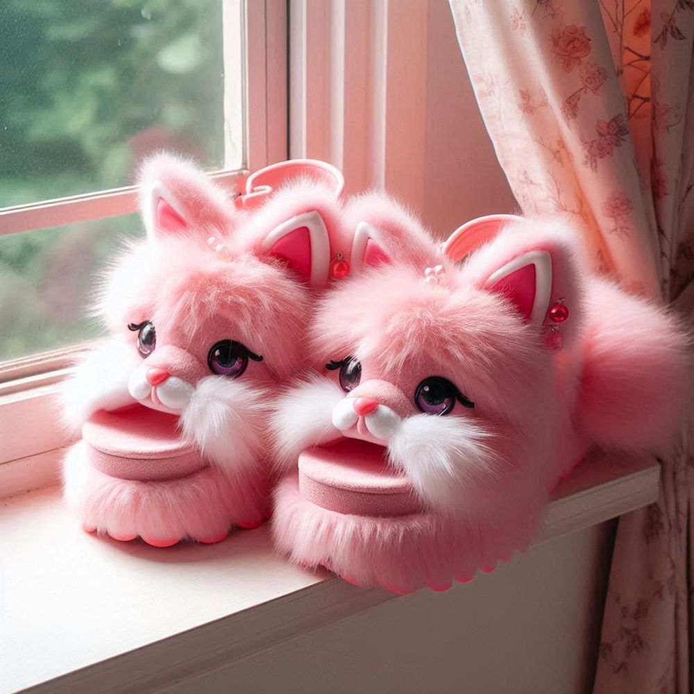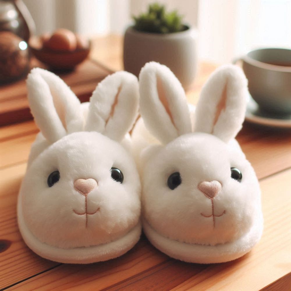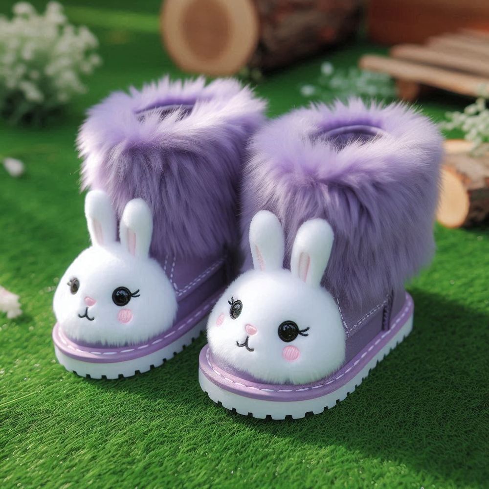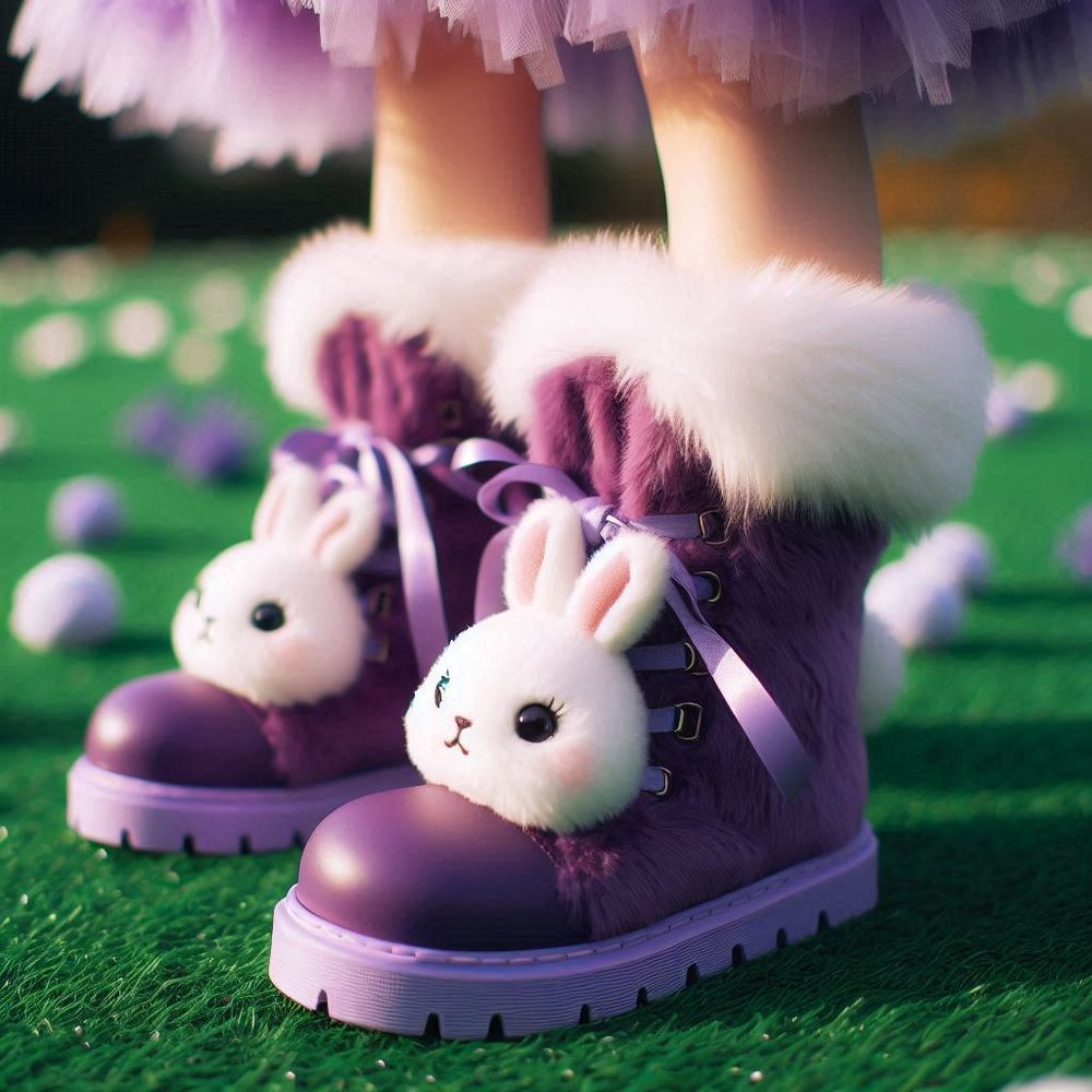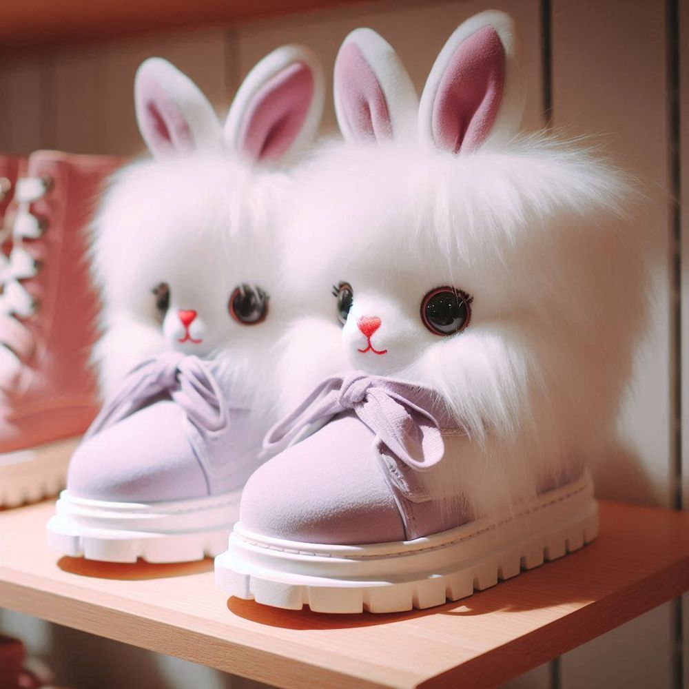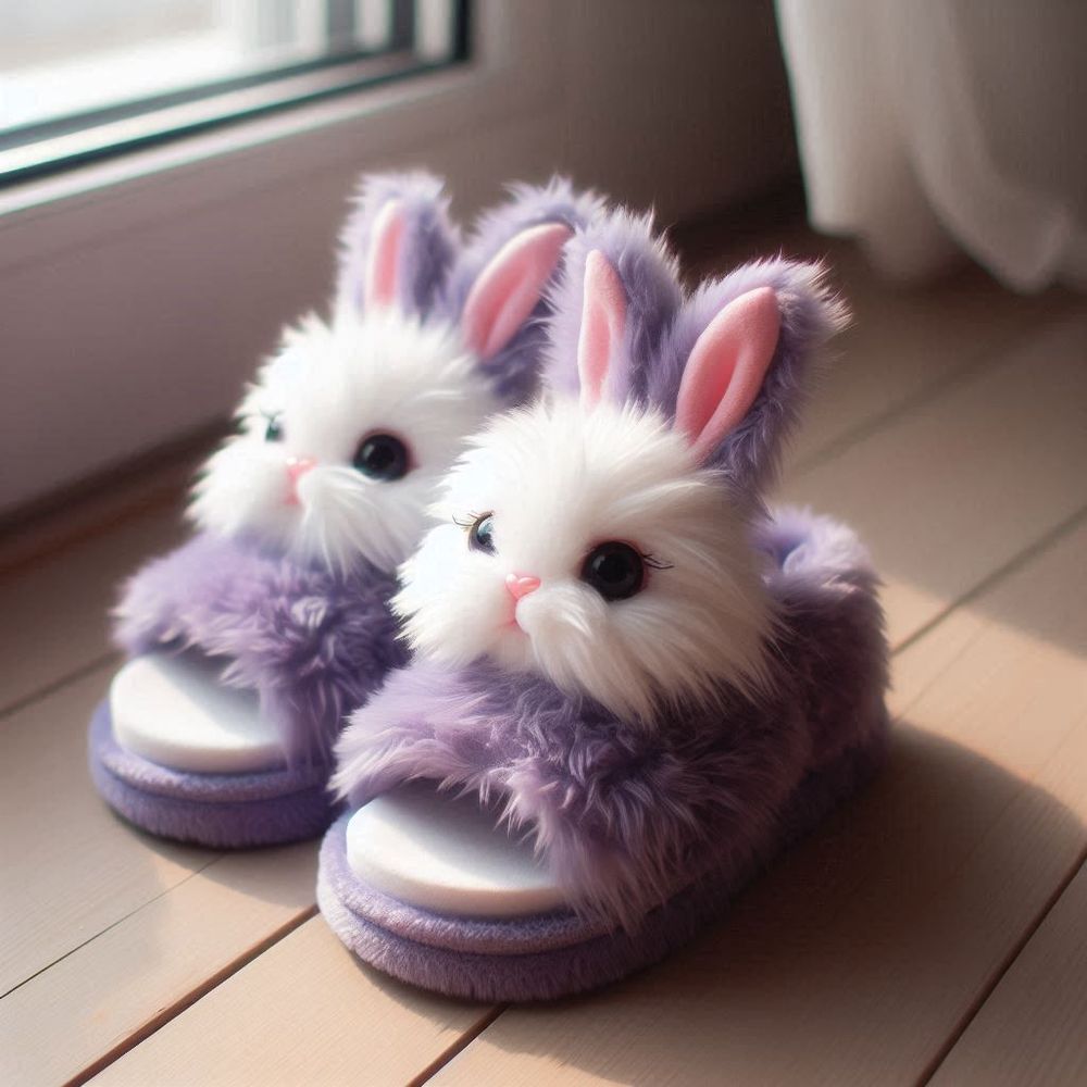也不乏看到偷偷跑到桌上、窗台上、窗戶邊或者草地上的毛茸茸兔子鞋,當然也有被主人好好的穿著的紫靴白兔鞋。