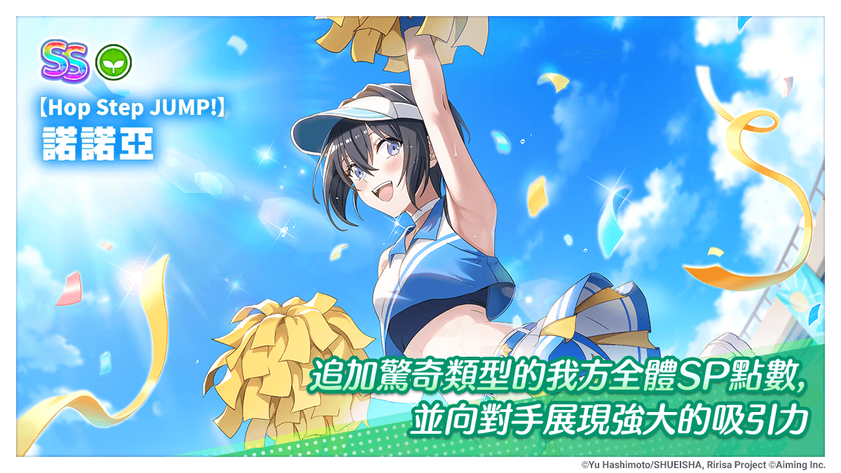 配合期間限定活動『Let’s Go NONOA!』推出的期間限定轉蛋角色【Hop Step JUMP!】 諾諾亞,是名追加驚奇類型的我方全體 SP 點數並向對手展現強大吸引力的日常主題 SS 奇妙(綠)屬性角色,擁有本角色於期間限定活動『Let’s Go NONOA!』可提升活動硬幣獲得量。