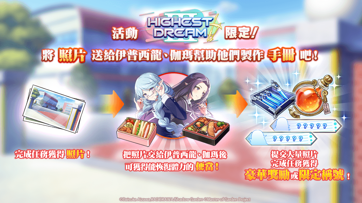 期間限定活動『HIGHEST DREAM Ⅲ』為挑戰活動限定關卡及 Boss 藉此來獲得角色碎片、幻魔石等豐富獎勵,隨著關卡進度還能解鎖活動限定劇情,遊玩活動收集活動硬幣&討伐積分 pt,並在活動商店透過活動硬幣兌換各式素材。