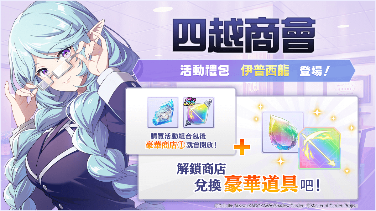 於四越商會內新增活動禮包【有隱情的女高中生】伊普西龍,內容包含了 角色碎片、玉白祝福之劍魔道具 等道具。
