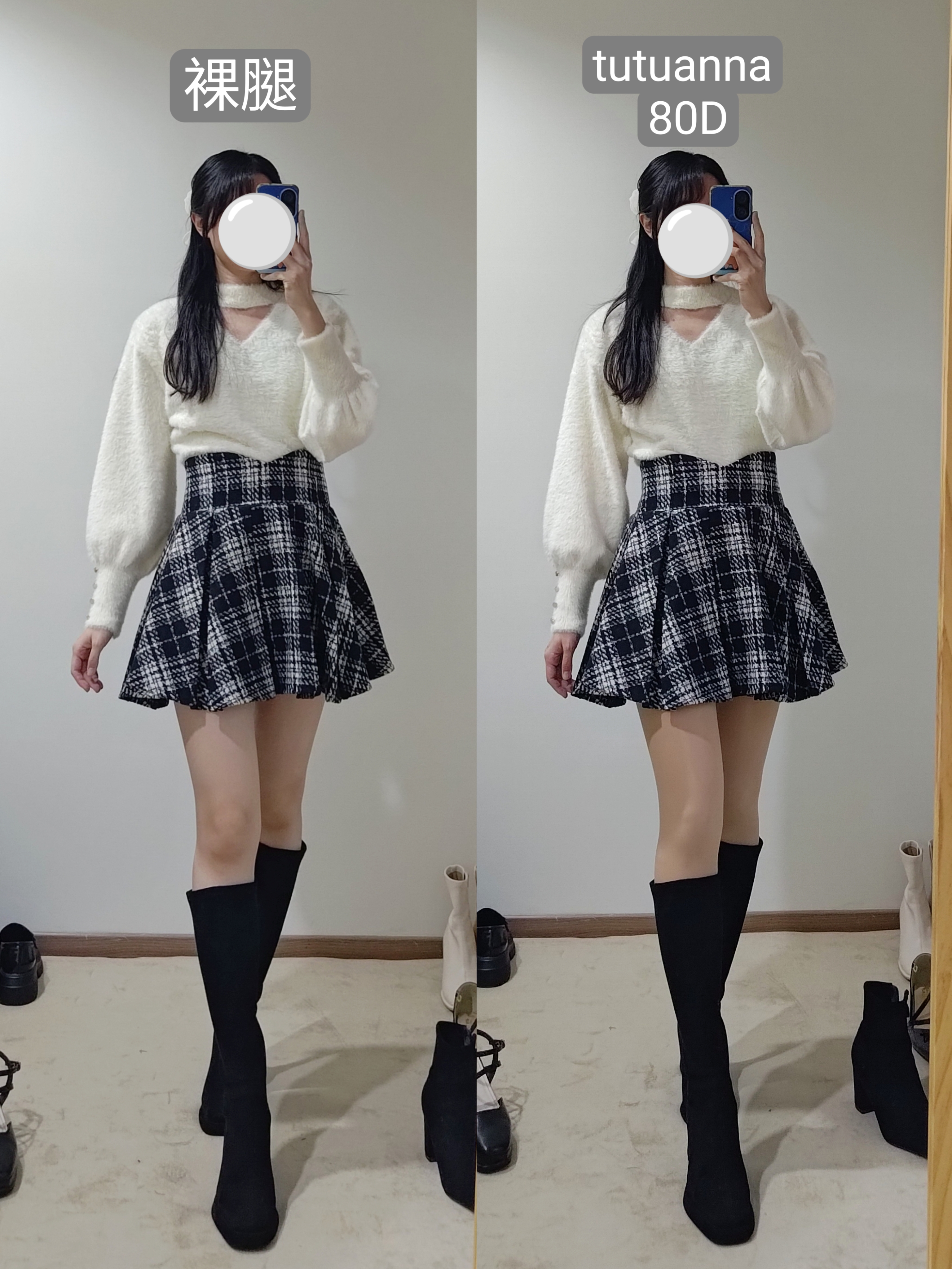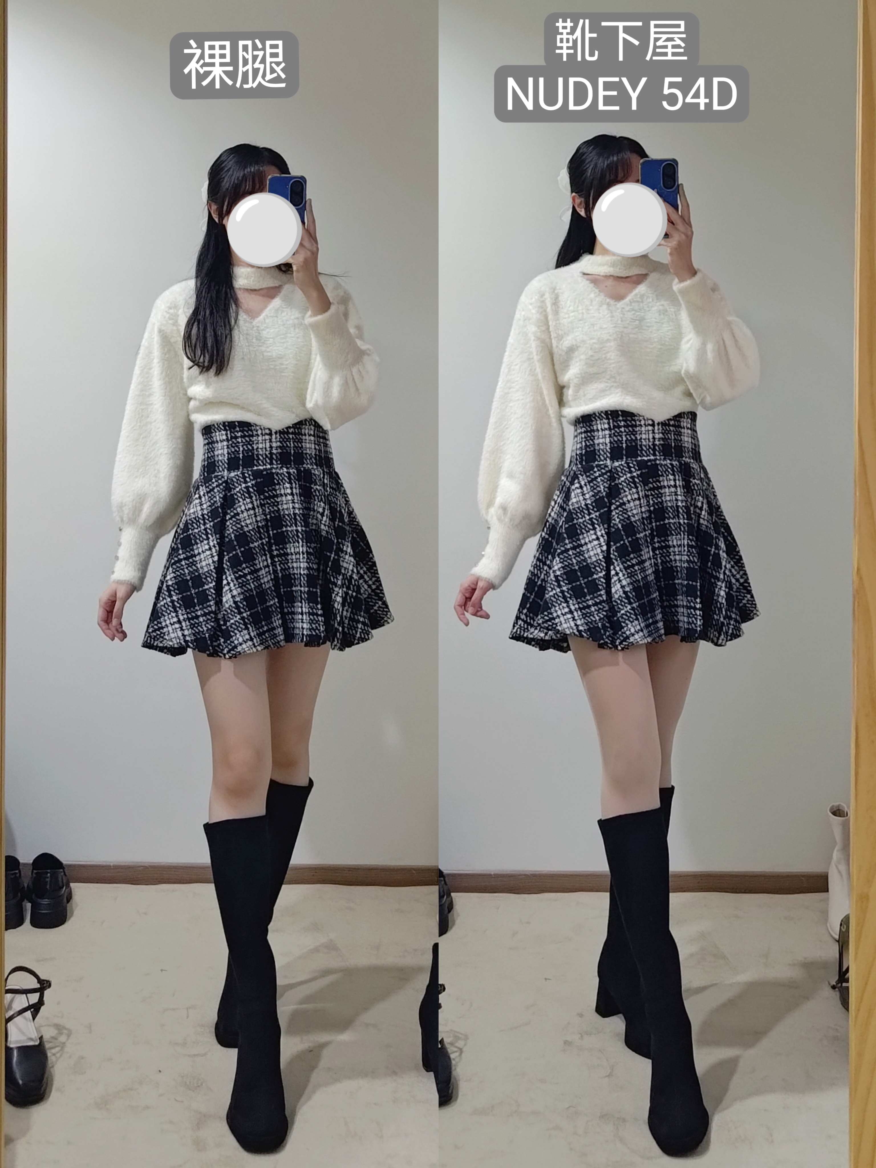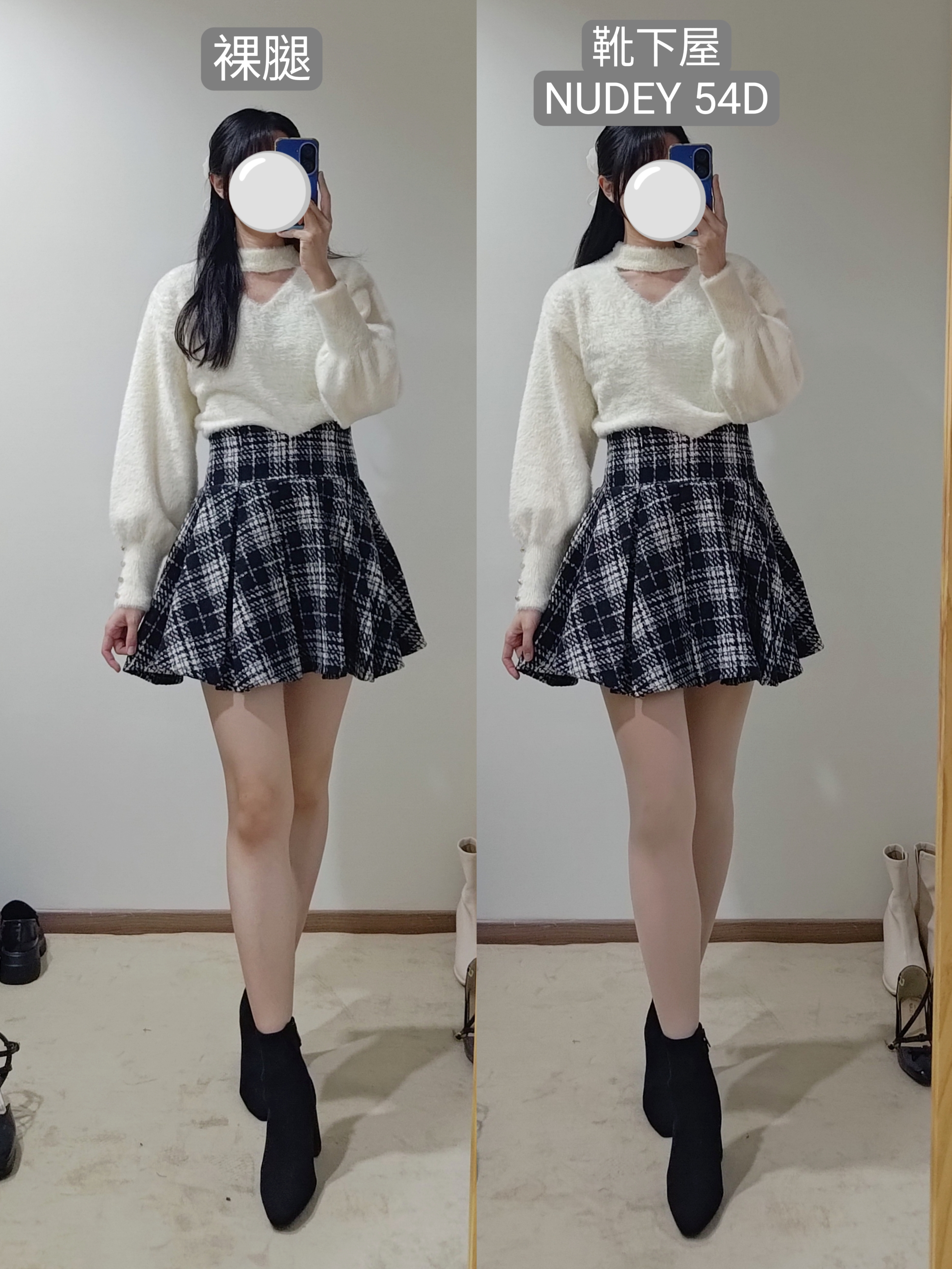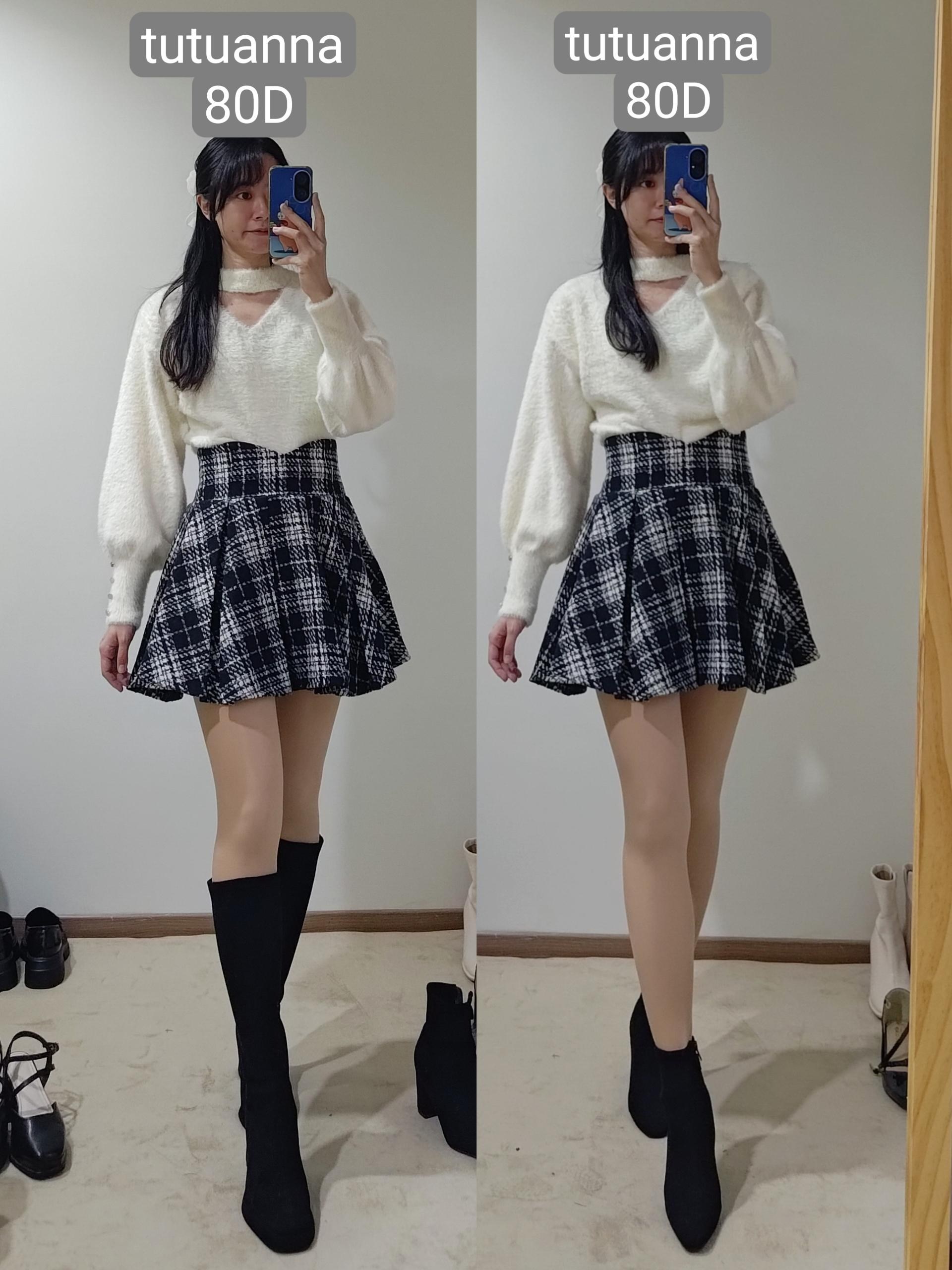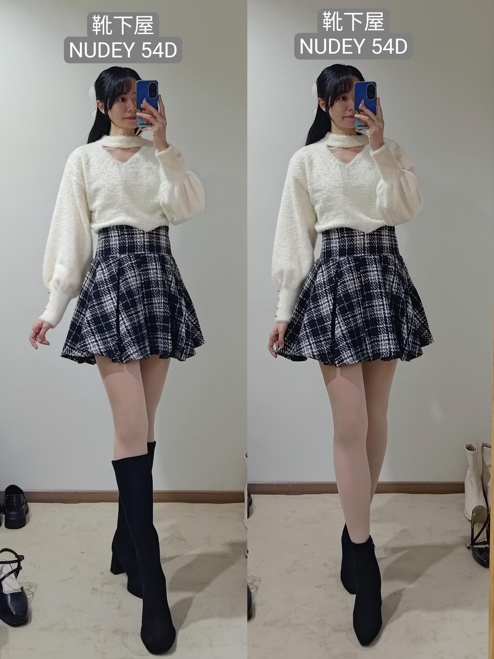 不過像這種厚度的絲襪膝蓋後方一定會有皺摺,我自己是會配長靴,看起來會自然一點點
