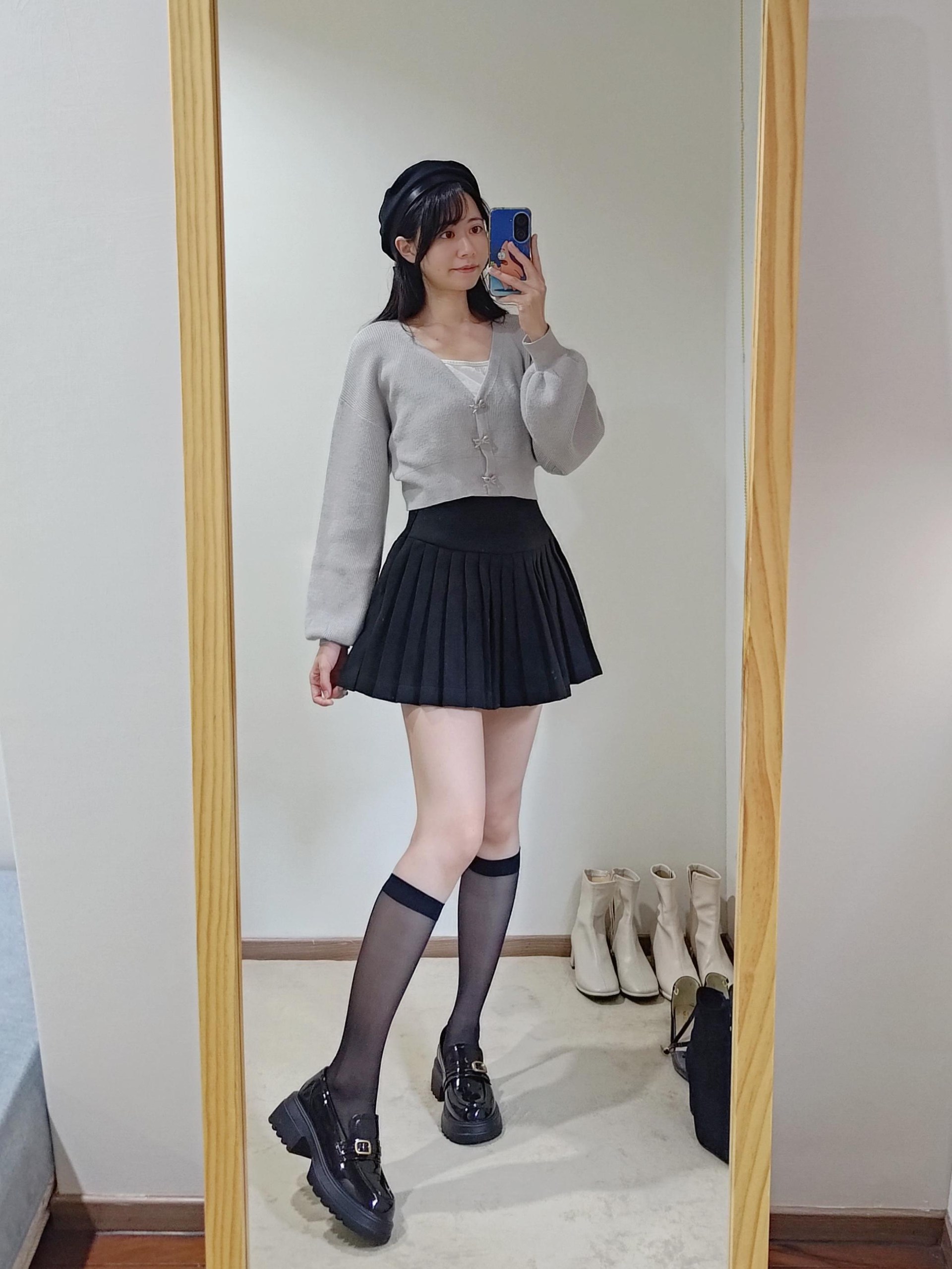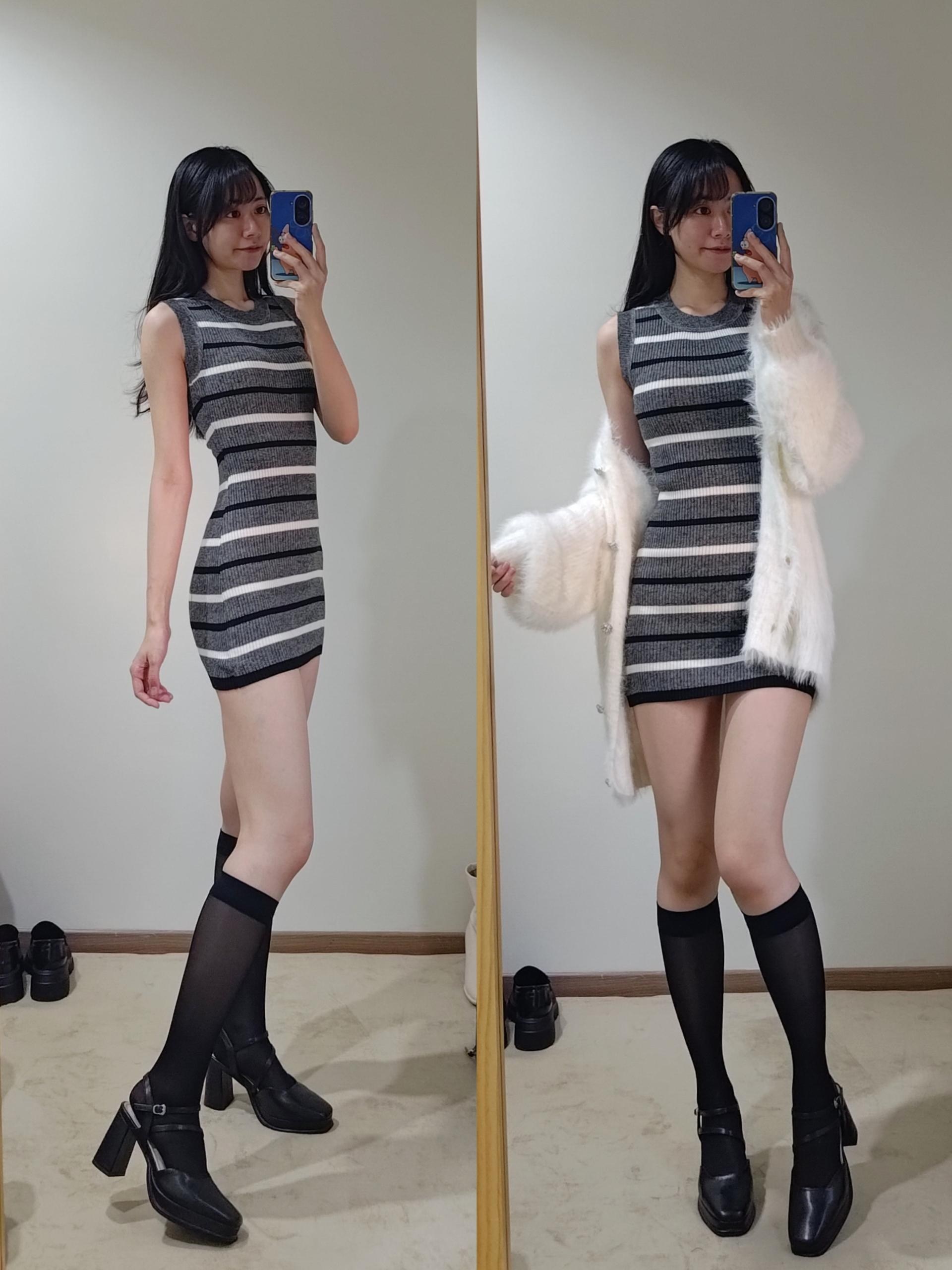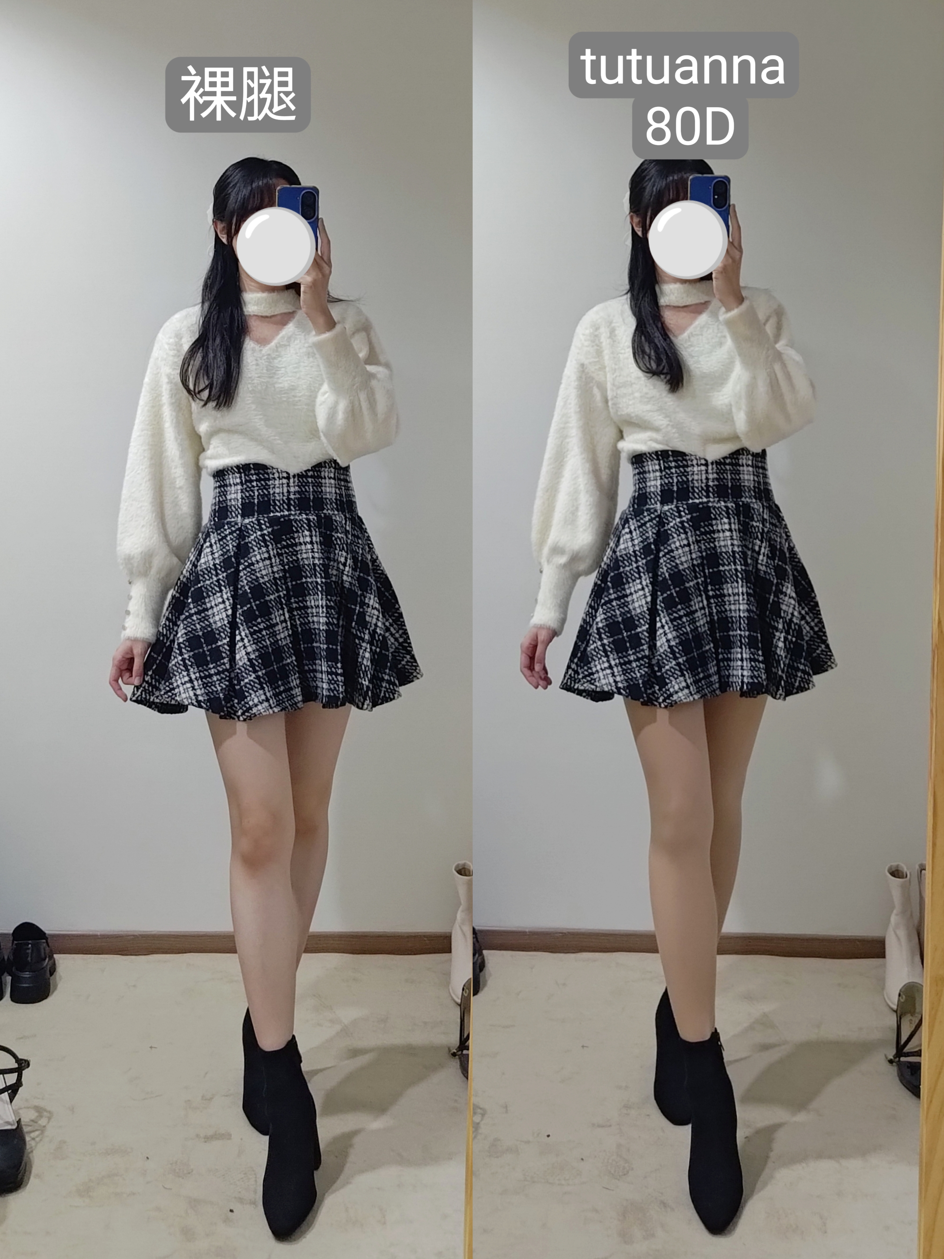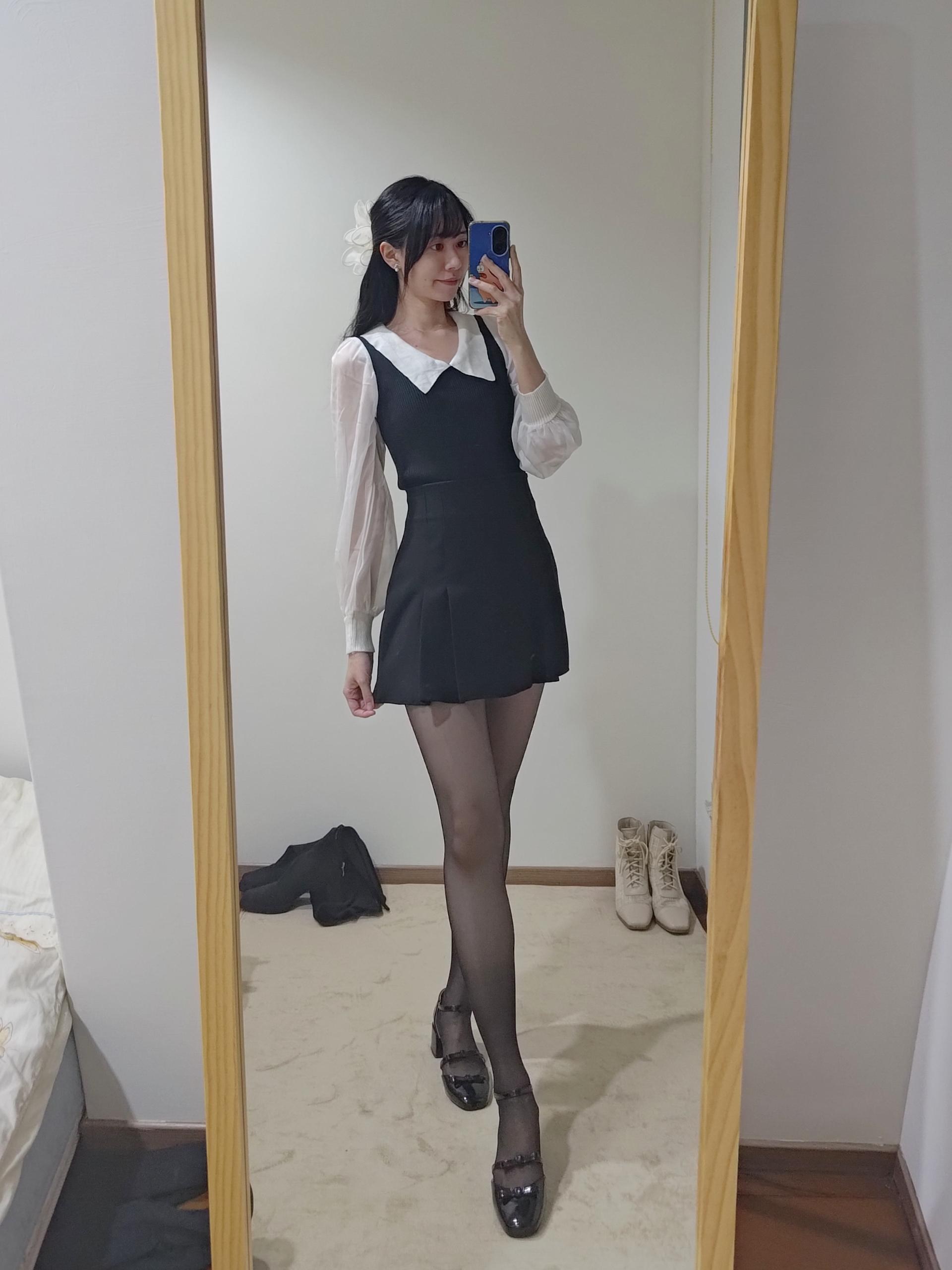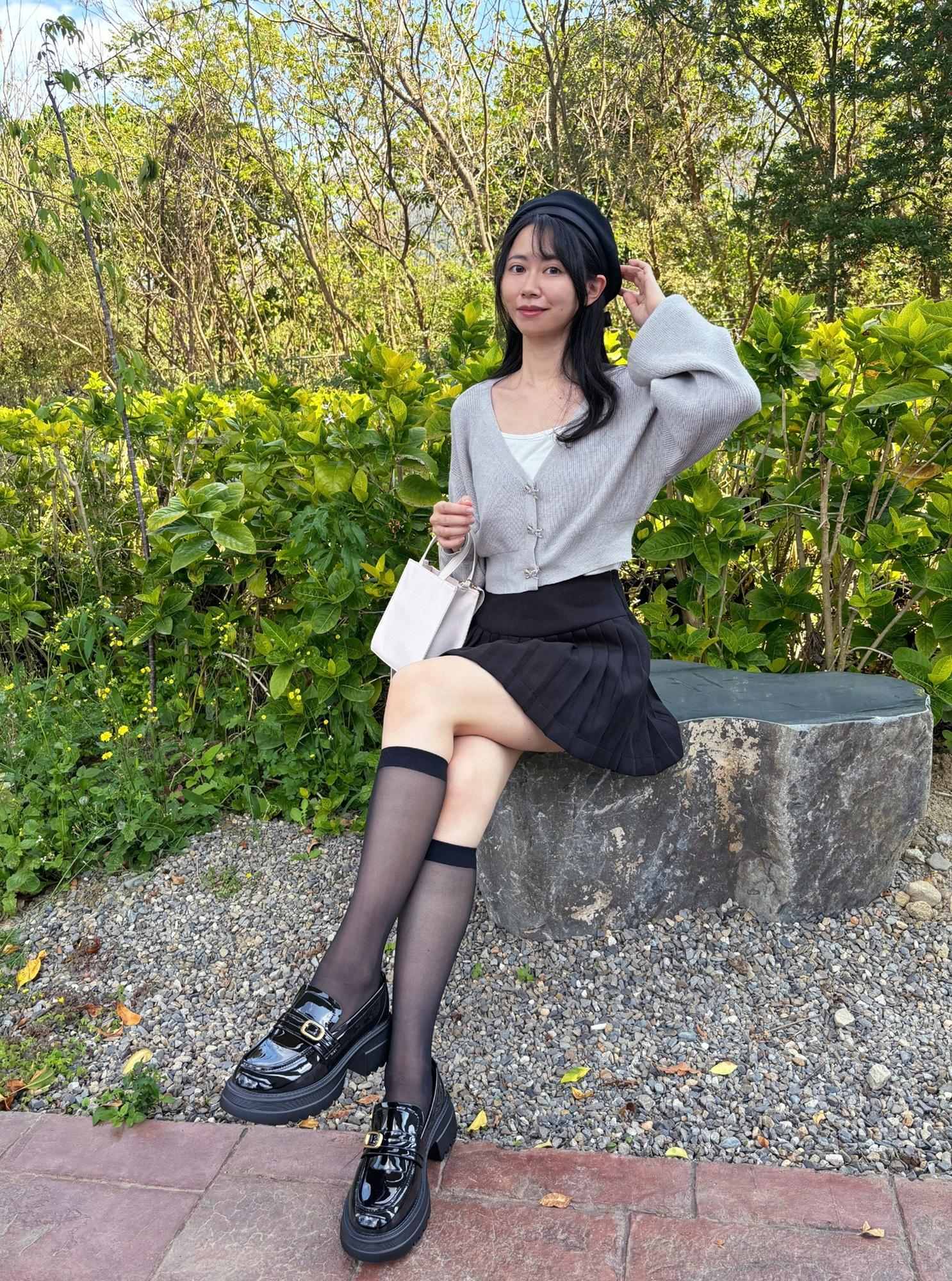 不過像這種厚度的絲襪膝蓋後方一定會有皺摺,我自己是會配長靴,看起來會自然一點點