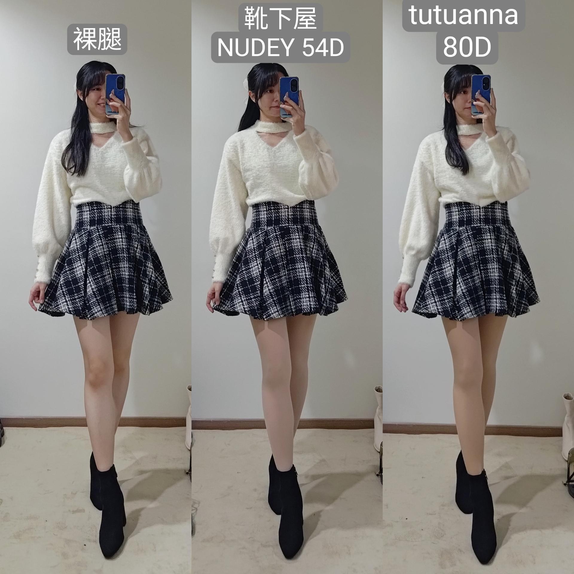 裸腿/靴下屋54D/tutuanna 80D的對照圖看起來tutuanna比較接近原膚色,靴下屋的偏白