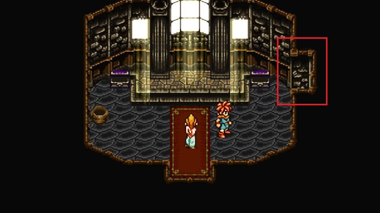 戰鬥完後青蛙加入, 調查風琴, 出現隱藏門, 進門後左走, 繞怪開寶箱, 左邊樓梯上去