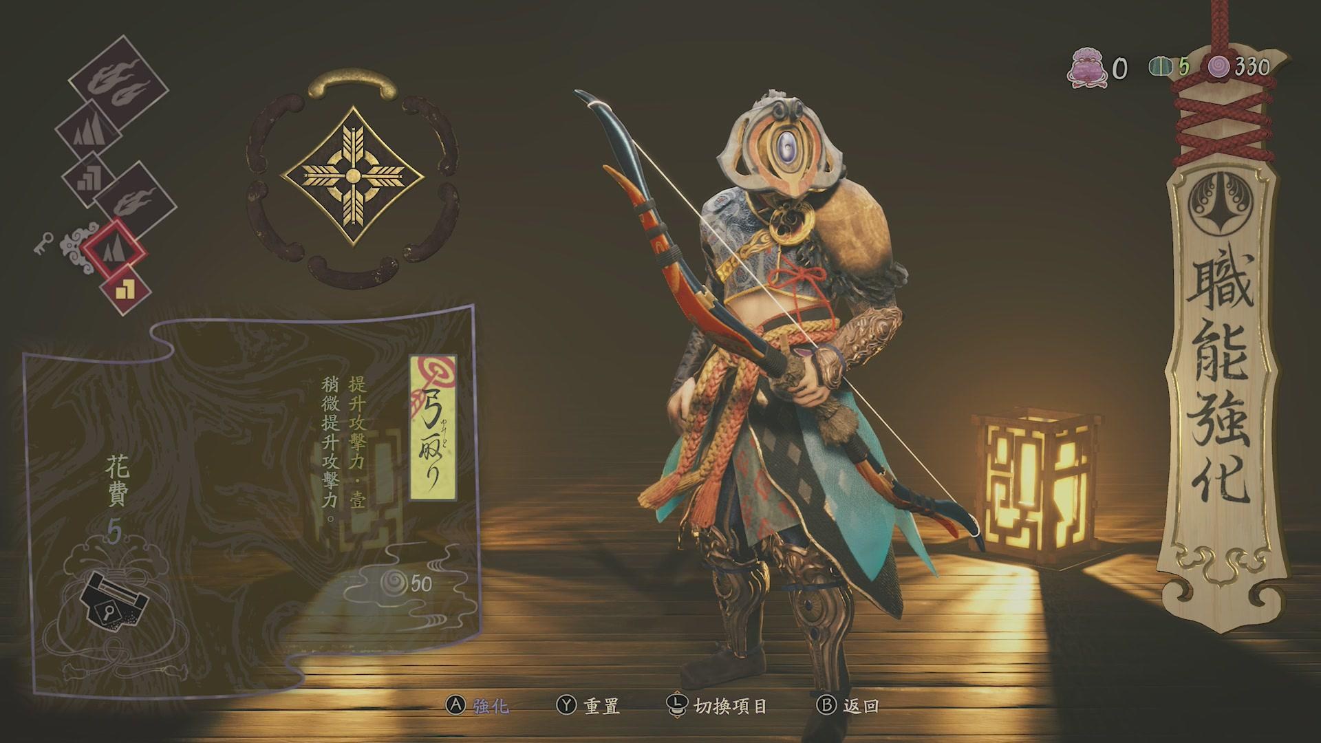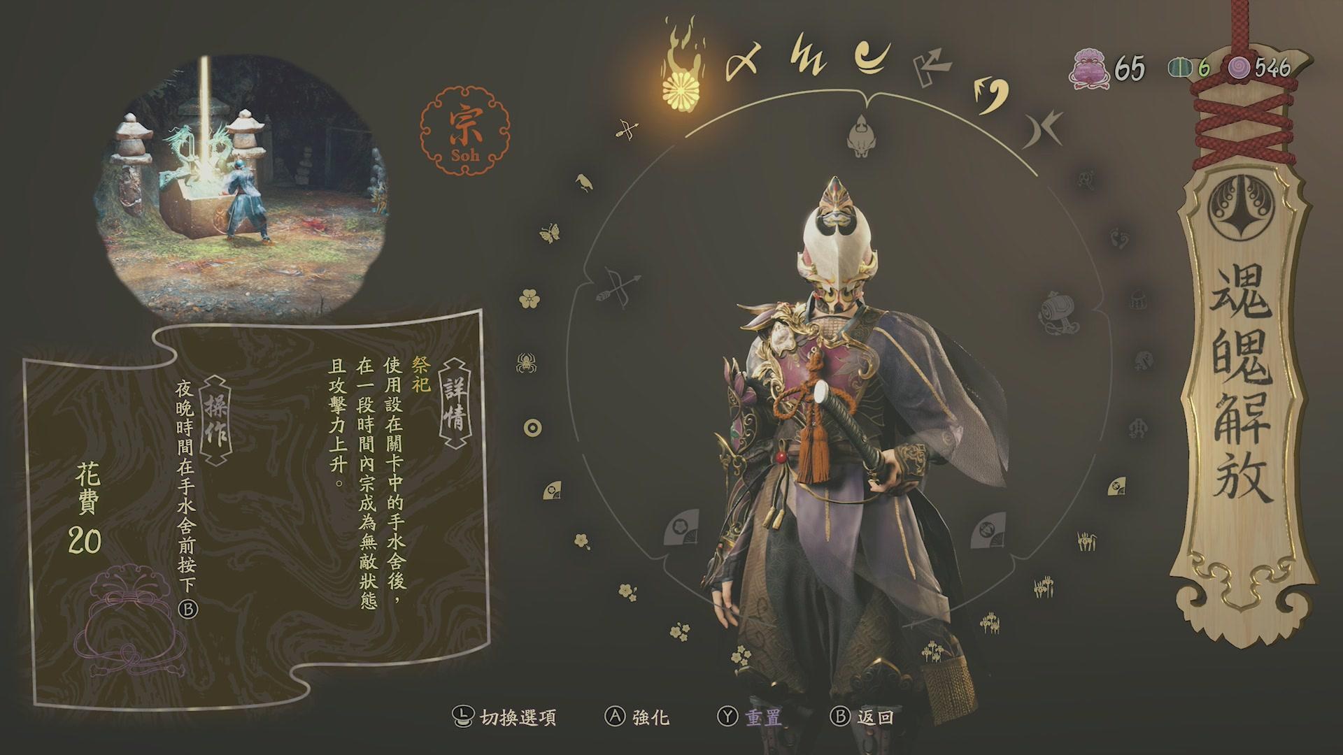 8. 關於宗的相關技能方面,弓術的絕招要記得裝備,由於裝備圖像太小導致經常在變更後遺漏,另外祭祀這項限時無敵技能在BOSS戰相當實用,雖然大半關卡就算沒有也能通過(孤舟玩到最後一關卡了一回才發現這項技能的好處XD),但如果遇到卡關時可視為手段之一