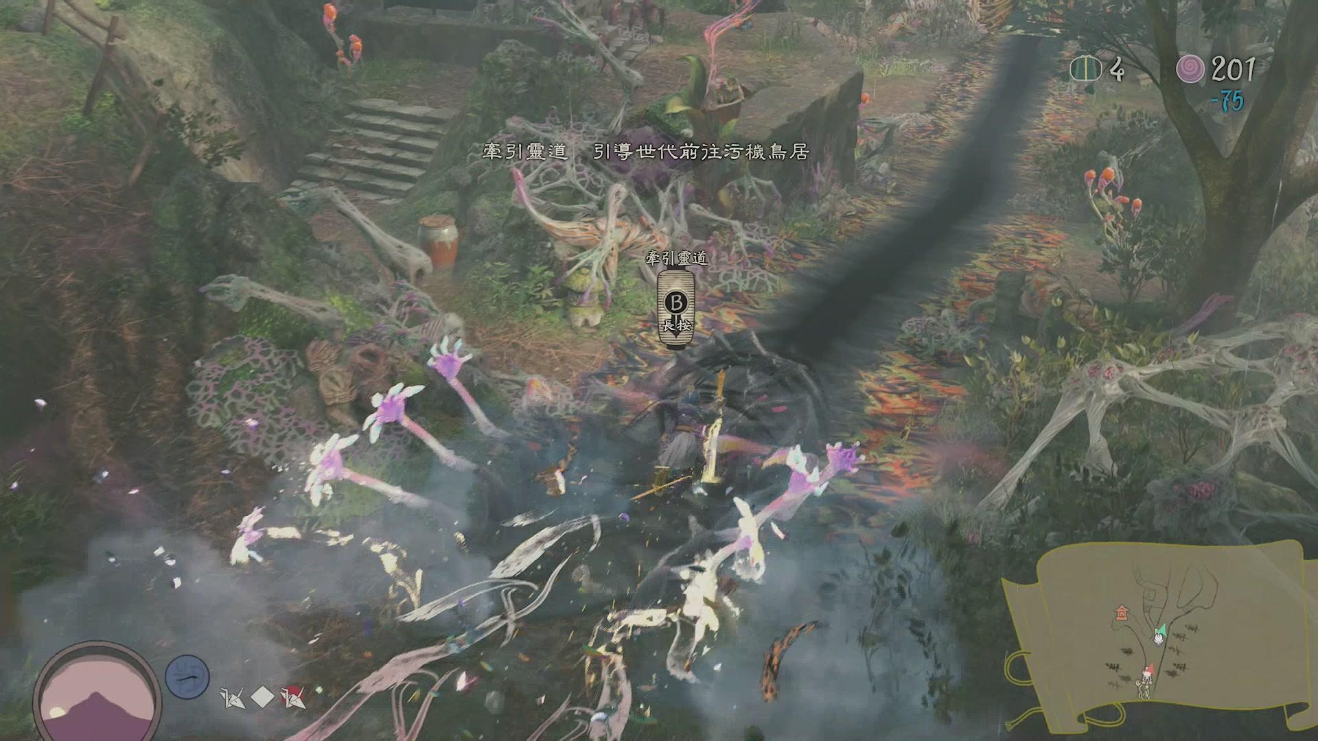 在進入關卡後,玩家身為宗,首先要畫地開啟前進的路線,讓世代沿著所畫的路線執行跳舞除穢儀式慢步前進