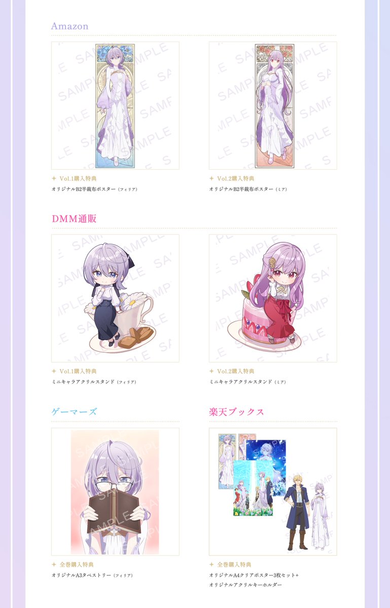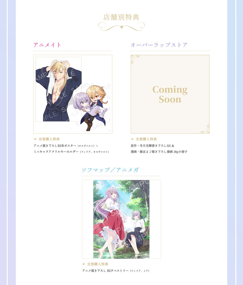 作為早期預約特典於第 1 片可獲得 角色原案・昌未 全新繪製迷你色紙(フィリア、オスヴァルト)、第 2 片可獲得 角色原案・昌未 全新繪製迷你色紙(ミア、フェルナンド),店鋪別特典方面共有 7 間店鋪並陸續公開特典插圖。