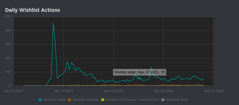 當時釋出商店頁面的3周內平均一天會新增100個願望清單,但之後能觸及到的人都看過以後就漸漸下滑,一個月後的時間點平均一天只剩30個願望清單。
