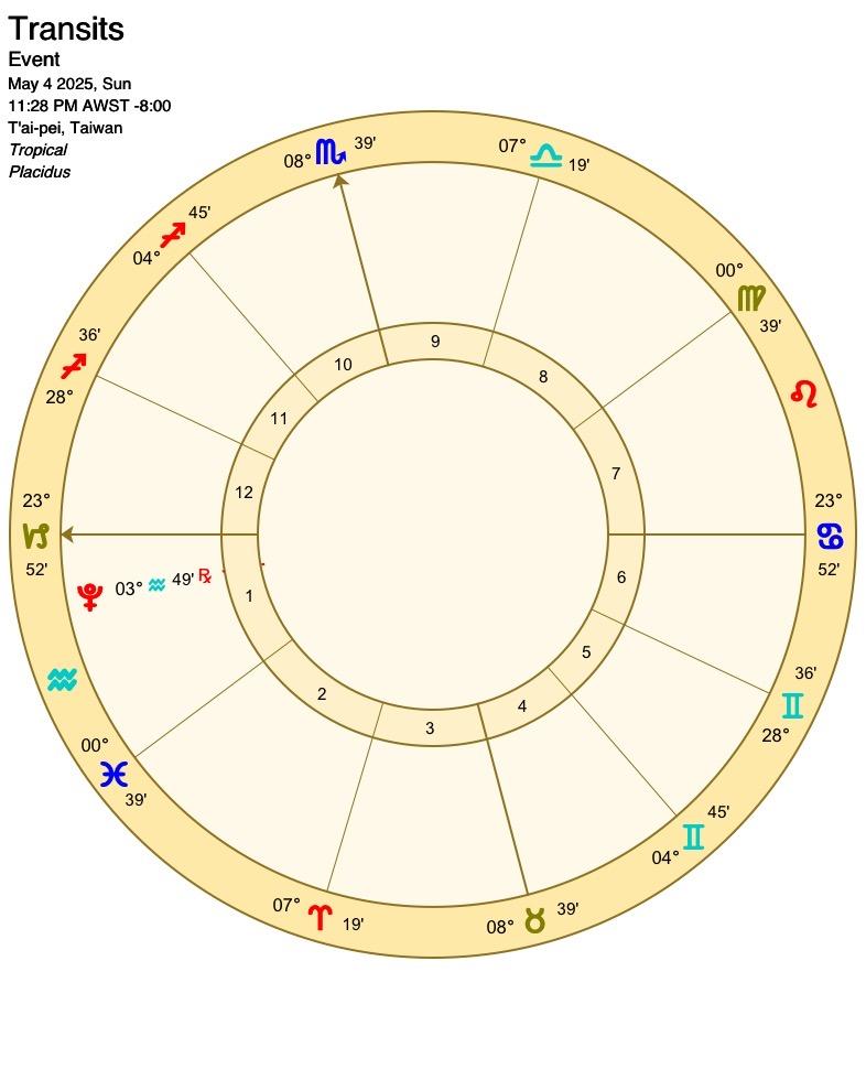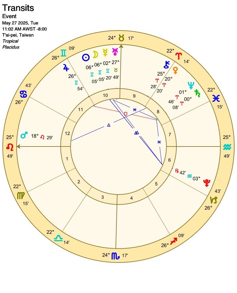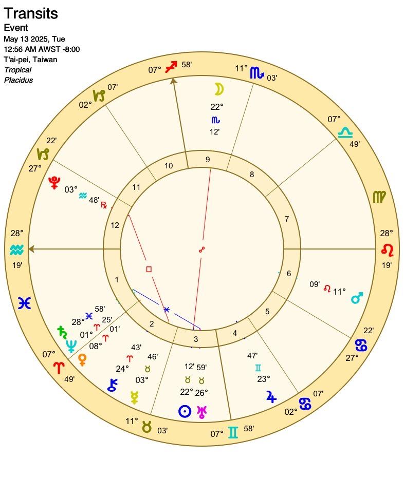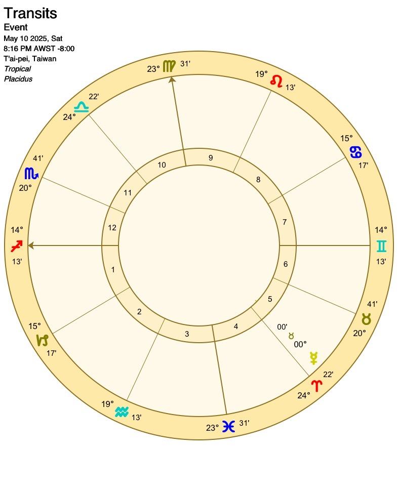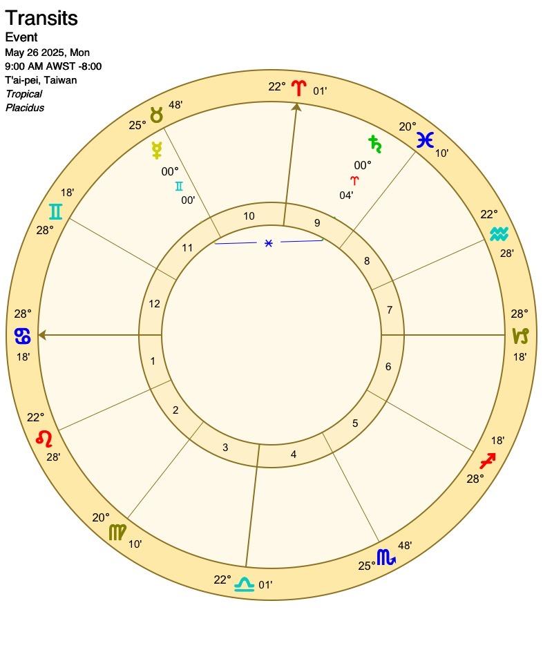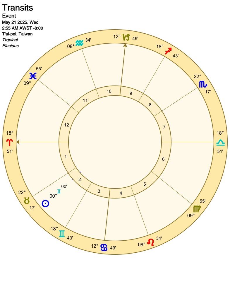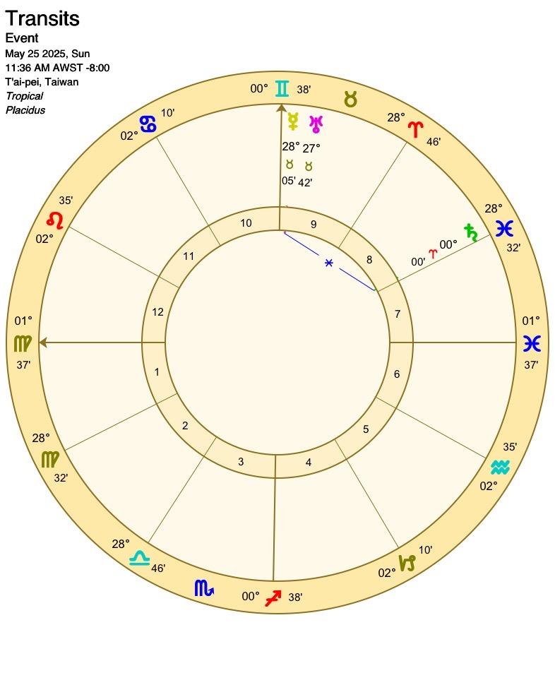 太陽會先和天王星、土星產生相位,隔幾天後才進入雙子座,太陽在末度點出的事情會在進入雙子後被大肆討論,可能是民生經濟或是受害者,而太陽雙子也帶著好奇、串連、輕浮的特質,以好的方面來說會有不同面向角度的聲音,比較不好的方面是人多口雜的紛擾,有趣的是太陽在這個月和外行星們(天、土、海、冥)產生很多相位,這會照亮、讓人意識到這幾個星所帶來的社會或世界議題。