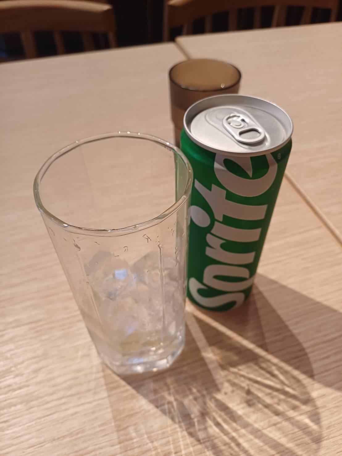 點飲料時,服務生給一個裝冰塊的玻璃杯,以及點的飲料放到餐卓上,而按照汽水的喜好,我偏向於:雪碧>可口可樂>黑松=百事可樂>芬達>維大力等幾種牌子來做排序。
