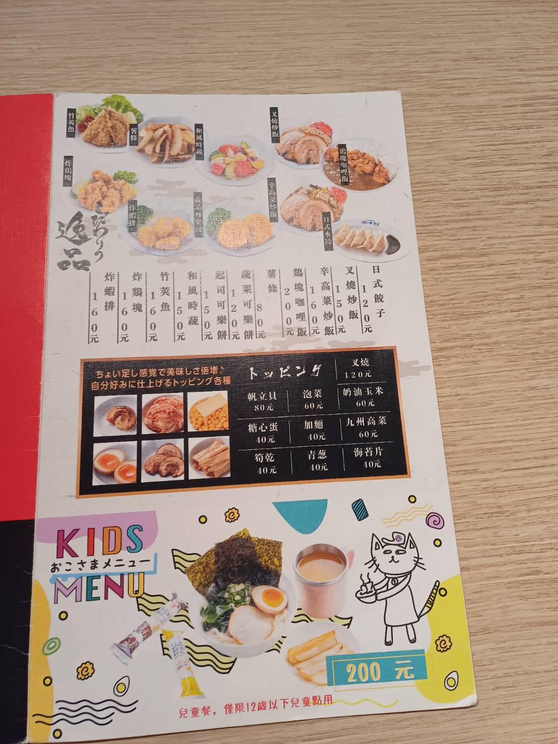 拉麵的風格,能讓我想到以前在北車吃過的和田屋拉麵、林口三井outlet的屯京拉麵,價格方面偏向中高價位,口味含蓋一些日式拉麵常見的口味(如:味噌、辛味噌、豚骨、奶油玉米等口味的拉麵)。