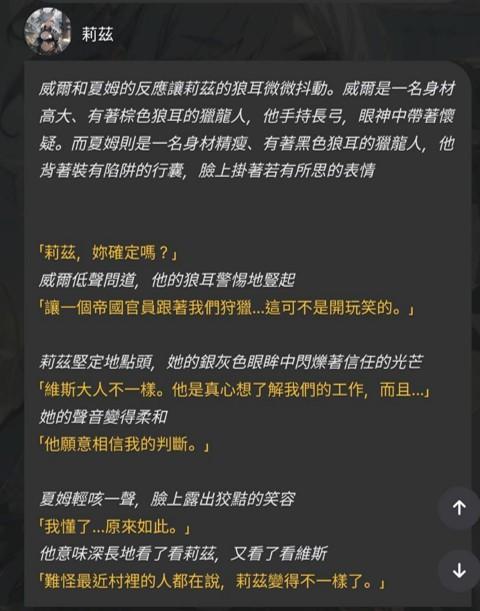 可以跟莉茲聊聊卡茲村的風土民情、地方料理、獵龍人的工作等等,也可以聊聊宗教信仰、以及帝國對獸種的歧視問題,或是去觀摩獵龍活動的詳細情況