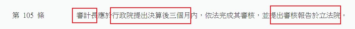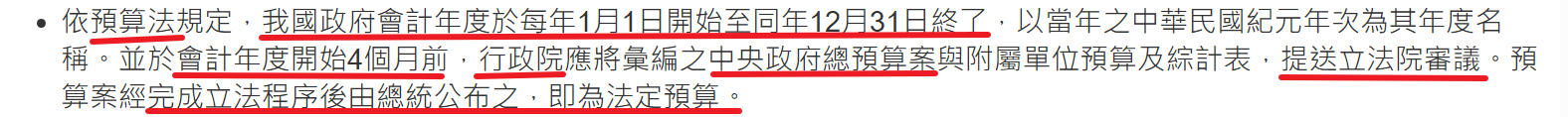 - 會計年度開始前四個月,由行政院主計總處,將總預算案的草案,送立法院三讀。經總統公布,才是法定預算。(行政院主計總處)