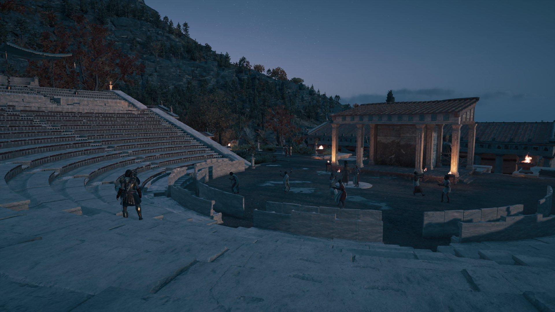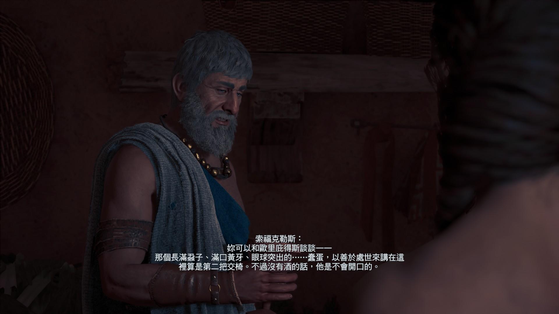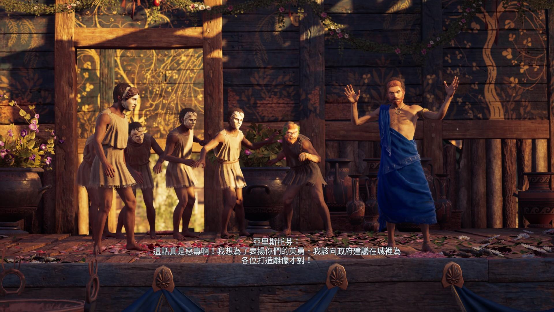 接著,《刺客教條:奧德賽》的故事發生於希臘,這對我來說更是熟悉不過。我在念五專的時候是應用外語科,曾修習「希臘羅馬神話」,因此對於這時期的神話我是有很深刻的研究;而到了大學時我進入藝術大學攻讀戲劇學系,對於從學院出來的戲劇系學生來說,戲劇史的第一頁都是以「希臘悲劇」開始。因此在遊戲裡,當我看見熟悉的劇場建築,甚至能和當年的希臘劇作家索福克里斯一同參加酒宴派對,那種感覺就像是學生時代的神話知識與青春記憶,突然被實體化成了一個可以走進去的世界。
