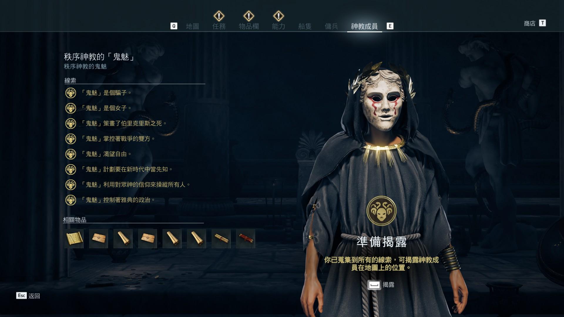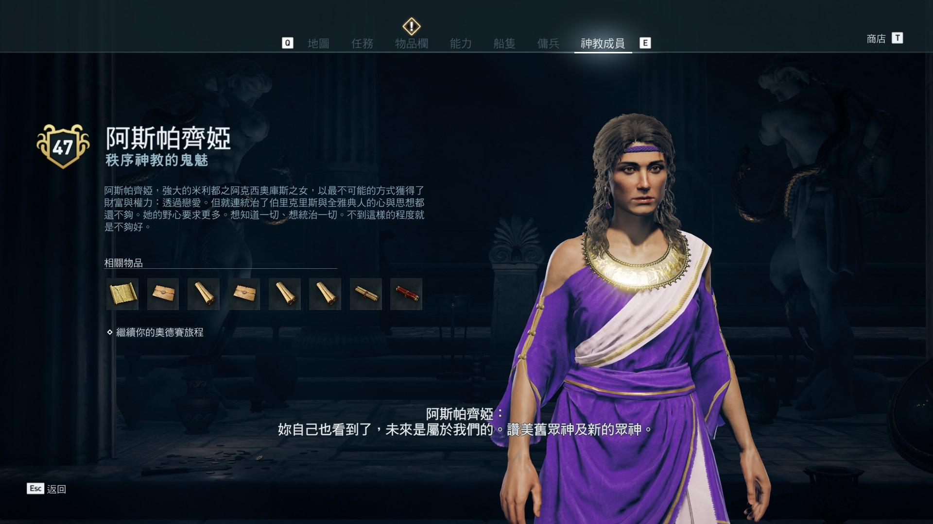 直接暴雷啦!總之秩序神教的最大Boss就是雅典的前任國王的老婆,她想要控制整個希臘之類的理由,主線她確實有幫助過主角,但其實她的野心真的也沒有描繪得很明確,我也是刷完主線才有空一個一個神教人員慢慢打,最後看到是她想說:「欸妳還活著喔?」