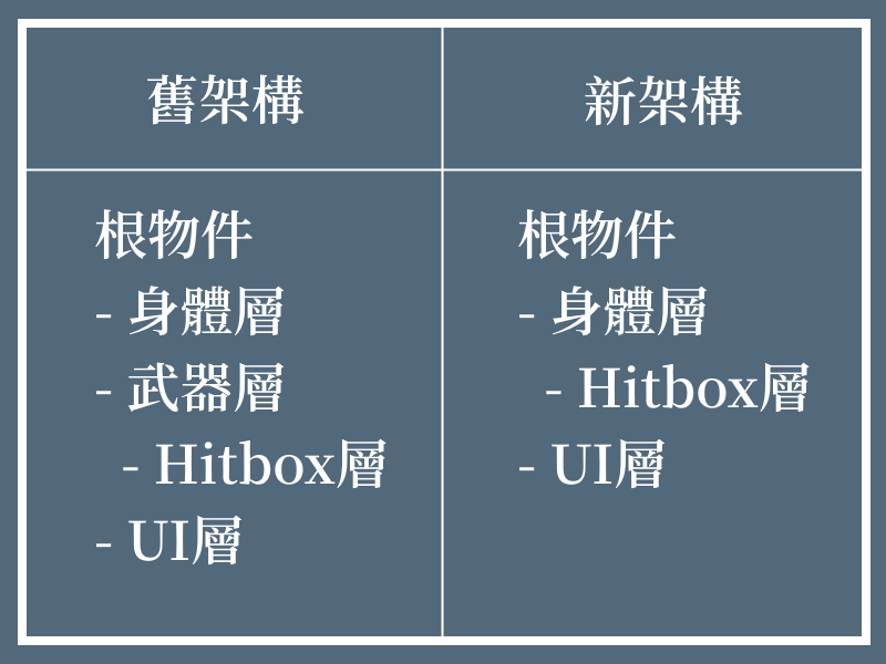 同時,因為併入了身體層,提示特效也不再因為武器層的旋轉使的方向性淪為無效資訊;在想做出差異化(如:X字閃光、十字閃光、環形閃光等)時,可以有更低的學習成本。