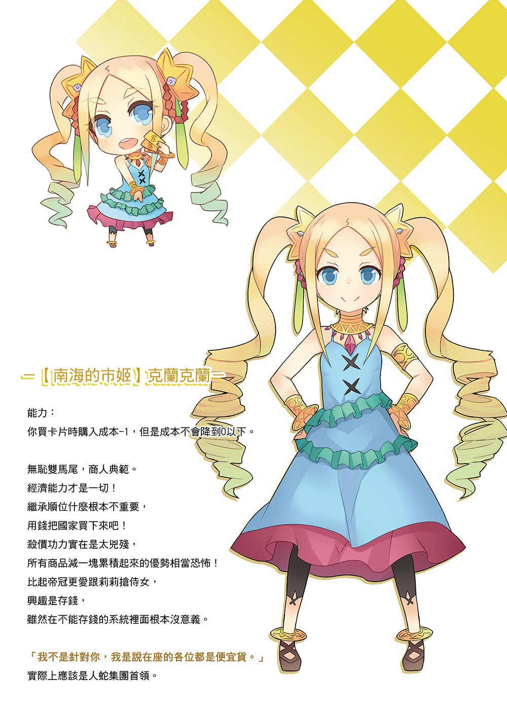 功能簡單,不論老手新手都能輕鬆上手的超人氣公主。不論是新手場老手場宮鬥場還是詛咒場,不論任何情況都相當好用的公主。買東西降 1 費效果感覺不強,但由於本作沒有購買次數限制,因此比起高價物降費,大量的低價物打折幅度會更有感。最誇張的莫過於是宮廷女僕,2 費買 2 分,換分效率比公爵還誇張。特性上因為很適合早期擁立,所以老是會跟莉莉搶女僕的壞人公主(咦?