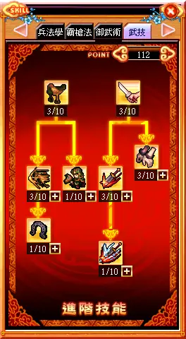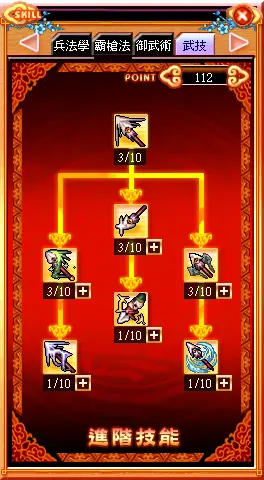 Lv.75 回馬槍,被動增加閃避成功率,並且距離2格內的攻擊閃避成功時造成反擊,反擊後進入冷卻。 Lv.80 霸國槍法,前方3x5直線攻擊技