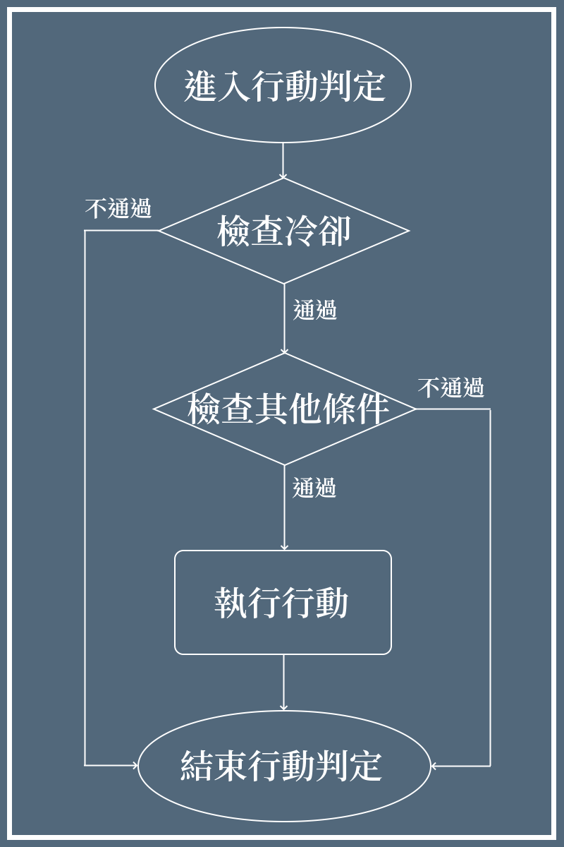 而加入佇列再執行的方式,也讓戰鬥設計除了原本「當條件達成時執行行為」之外,還可以針對特定情況排出固定的行動流程,使得可以更簡單的做出固定流程的敵人行為。
