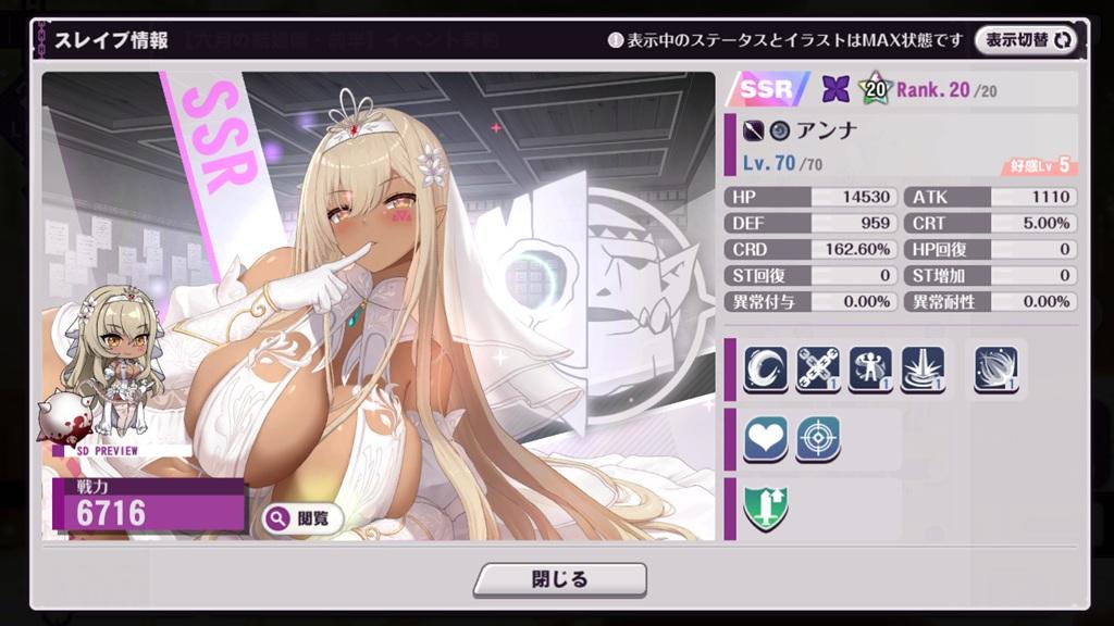 本次 PU 的新奴隸為 SSR 安娜(婚姻教官) アンナ(婚姻教官) :「婚姻教官・安娜 」是經驗豐富的獸人傭兵。一路走來人生波瀾萬丈的她,如今披上婚紗作為婚姻教官訴說自己的結婚經驗。