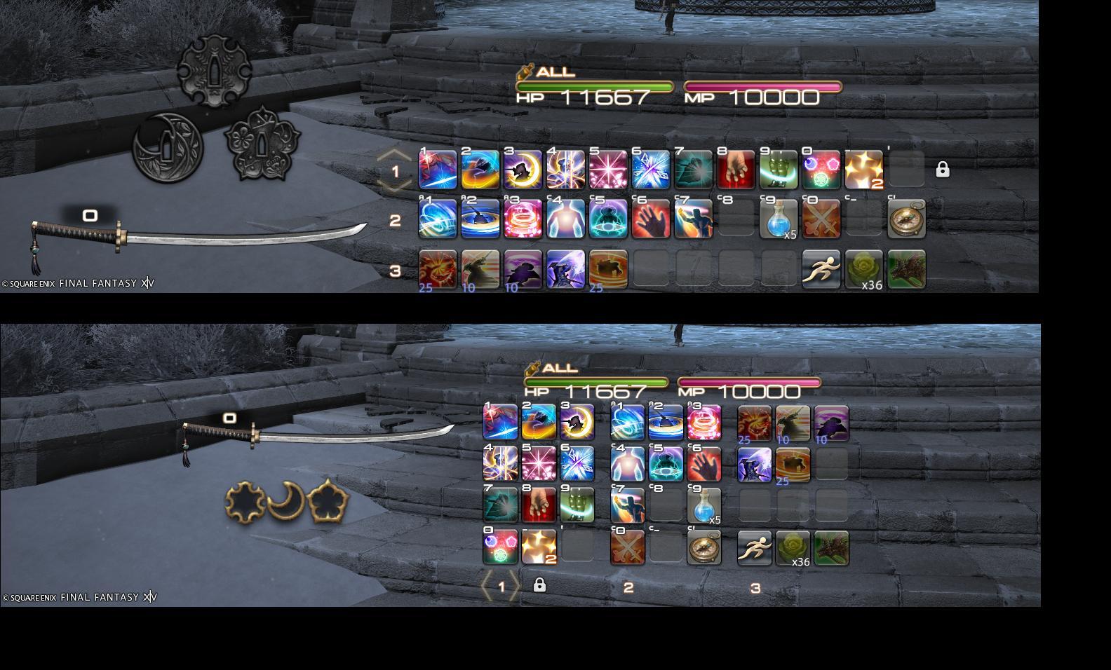 於是,現在開始用武士解主線需要習慣一下,畢竟按鍵連招完全不一樣,而且有一次太習慣有補血站A了,不小心沒注意血量就掛了。還有就是HUD圖層問題,系統預設的HUD我發現很不適合武士,把武士的招做了分類後,單體連招和範圍連招各分一個圖層後,不管是鍵盤還是滑鼠都不好施放,所以花了超多時間在改HUD,途中發現原來圖層可以放大縮小,真的是謝天謝地,因為武士的圖層比白魔導多(叫劍閃和劍氣),超級擋畫面的。感覺花了快90分鐘在改圖層,途中也稍微確認一下放招順序會不會卡卡的,但至少改完後畫面感覺乾淨許多。