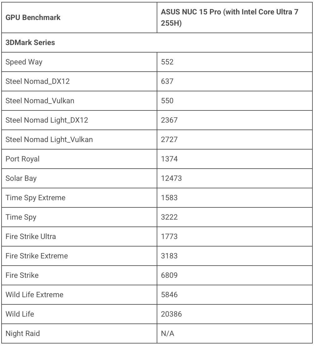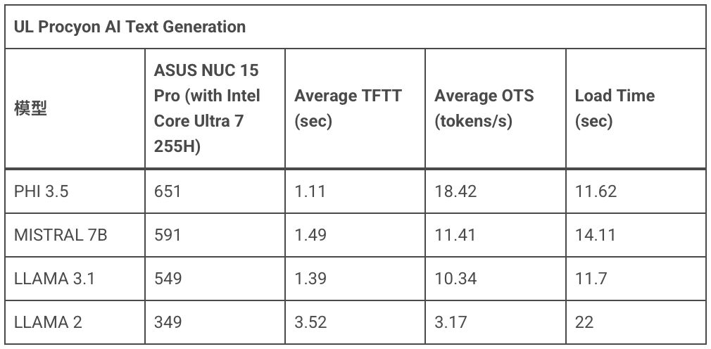 實際測試效能前,先來看看這次上手的 ASUS NUC 15 Pro 硬體規格,核心處理器方面搭載的是 Intel Core Ultra 7 255H,其 cTDP 為 40W,另外也有 Core Ultra 7 265H 版本,但最大差異在於增加 Intel vPro 技術。而內顯方面則是處理器搭載的 Intel Arc 140T。記憶體部分搭載的是 16GB DDR5 SO-DIMM,但本身最高可支援到 96GB 容量。AI TOPS 部分則是全機最高提供 99 TOPS 效能。